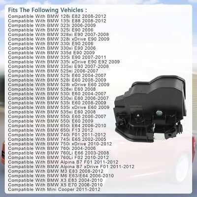 [COMPATIBLE WITH BMW]For 02-05 745i E65, 03-08 760Li E66, 04-10 X3 E83, 04-06 760i, 04-07 525i E60/530i E60, 06 325i E90/330i E90/330xi E90, 06-07 525xi/530xi E60/550i E60, 06-09 323i, 06-10 650i E64/X5 E70, 07-08 328xi E90/335xi E90, 07-11 335i E90, 08-09 528i E60/535i E60, 08 528xi E60/535xi E60, 08-12 128i E82/135i E88/M3 E83, 09 328i xDrive E90/335d E90/528i xDrive E60/535i xDrive E60/550i E60, 10-12 750i xDrive. Please scroll down to product description for complete list of model and year. [REPLACE PART NUMBER] 51227202148, 51227060296, 51224389476, 937-825, 51227318418. Please check the part number and fitment before placing order. [HIGH QUALITY] Long life-span matters, this rear right power door lock actuator motor latch is made of sturdy plastic housing, which helps protect the actuator from damage, can resist heat, corrosion and vibration. [QUALITY ASSURANCE] This power door lock actuator motor latch have endurance tests to guarantee long-term dependability and safety. [OEM FIT] The lock actuator motor latch is comparable in fit, form and function to the original part, meets or exceeds OEM standards. Exactly OEM design to replace your defective one.