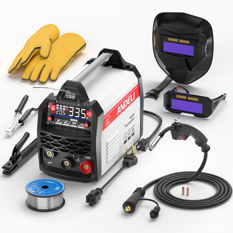 ANDELI 135Amp MIG Welder 110V/220V Flux Mig/Lift Tig/Stick 4-In 1 Gasless Welder Flux Core Welder Portable Welding Machine Large LED Digtal Display IGBT Inverter with Welding Torch and Welding Wire