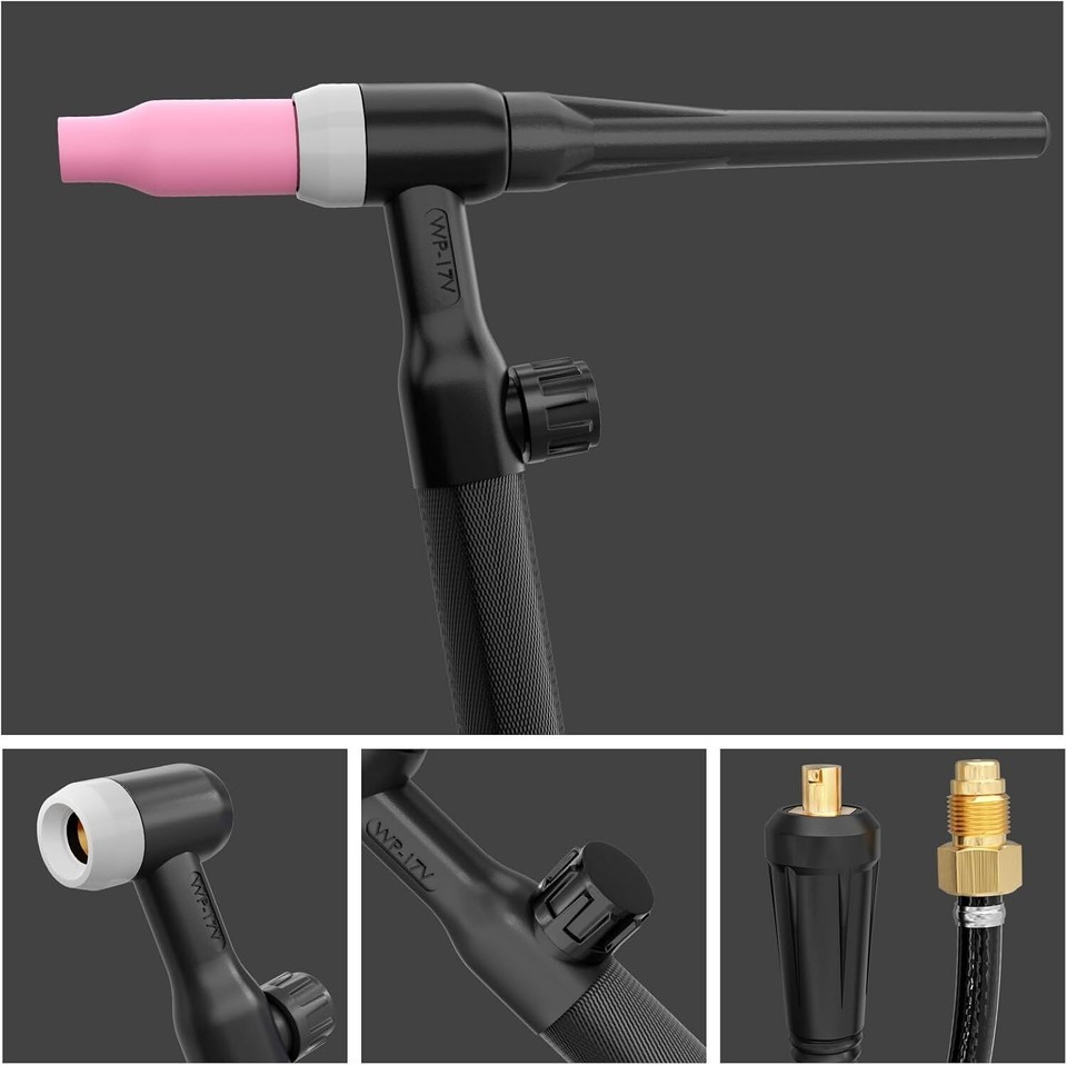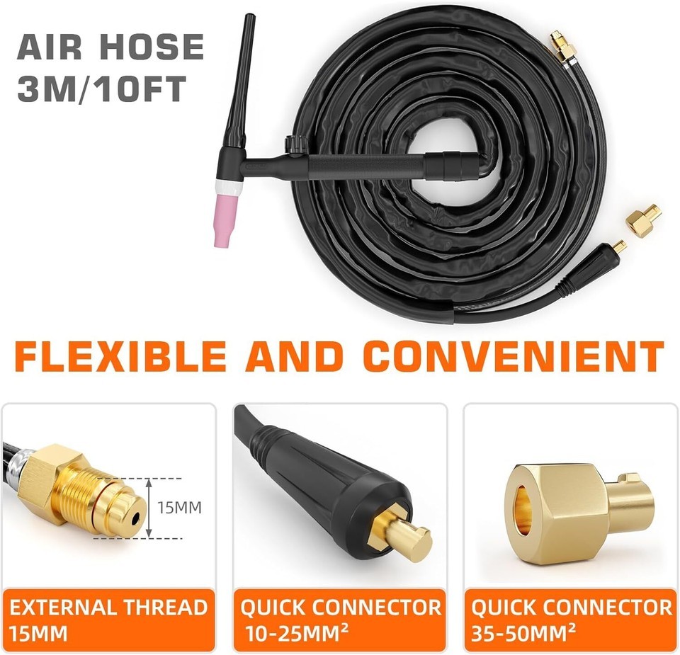 ?Packing List?The TIG torch comes with a 3 meter holster and 15mm gas cylinder connector, 1 x 10-25 quick connector, 1 x 10-25 to 35-50 adapter, 4/5/6 ceramic nozzle, 1 x 1.6mm/2.4mm/3.2mm collect, 1 x collect body, 1 x long back cap, 1 x short back cap. Compatible with FEIFANKE and all TIG welding machines on the market.