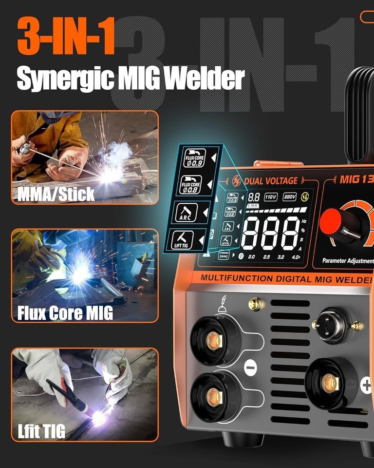 ?Synergic MIG Welder?FEIFANKE MIG135 welder will match the voltage intelligently. After selecting the wire diameter, you can control the wire feeding speed by adjusting the current (30-135A), and the flux core welder will recommend the suitable plate thickness. Large digital panel is clear and easy to operate for both beginners and professional welders.