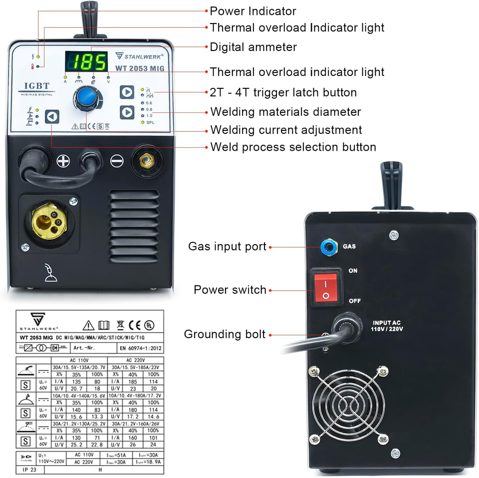 185A 3-In-1 MIG Welder - Flux Core/Mig/Lift Tig/Stick Welding Machine, 110V/220V Dual Voltage, Gas/Gasless, Portable Welder