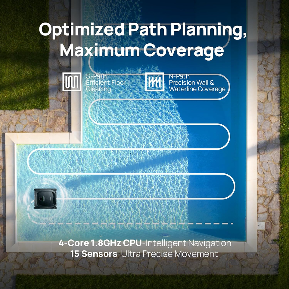 INTELLIGENT: Utilizing a cutting-edge CPU, 15 sensors, and sophisticated AI algorithms the A100 pool vacuum can map all pool types, optimizing for the best cleaning path while avoiding obstacles.