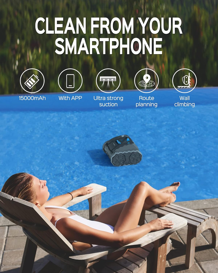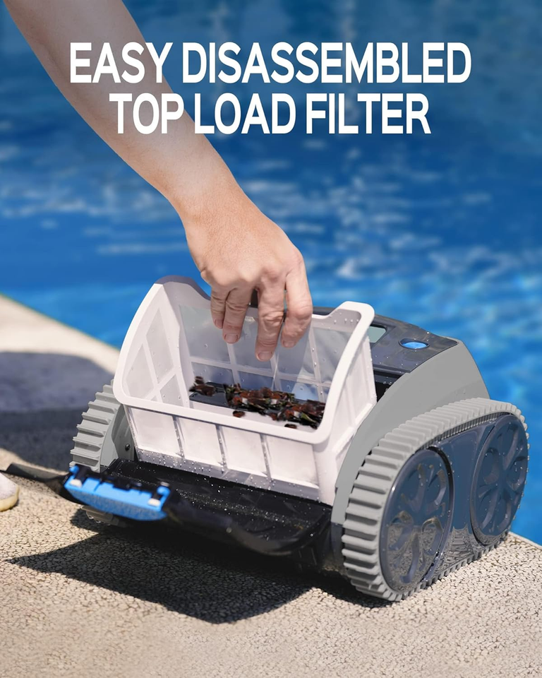 ?Cordless Strong Suction?Unleash the freedom of a cordless clean with this pool cleaner. Equipped with a powerful three-axis brushless motors and 2642 GPH powerful suction, it efficiently picks up sand, dirt, leaves, twigs, dust, and debris.