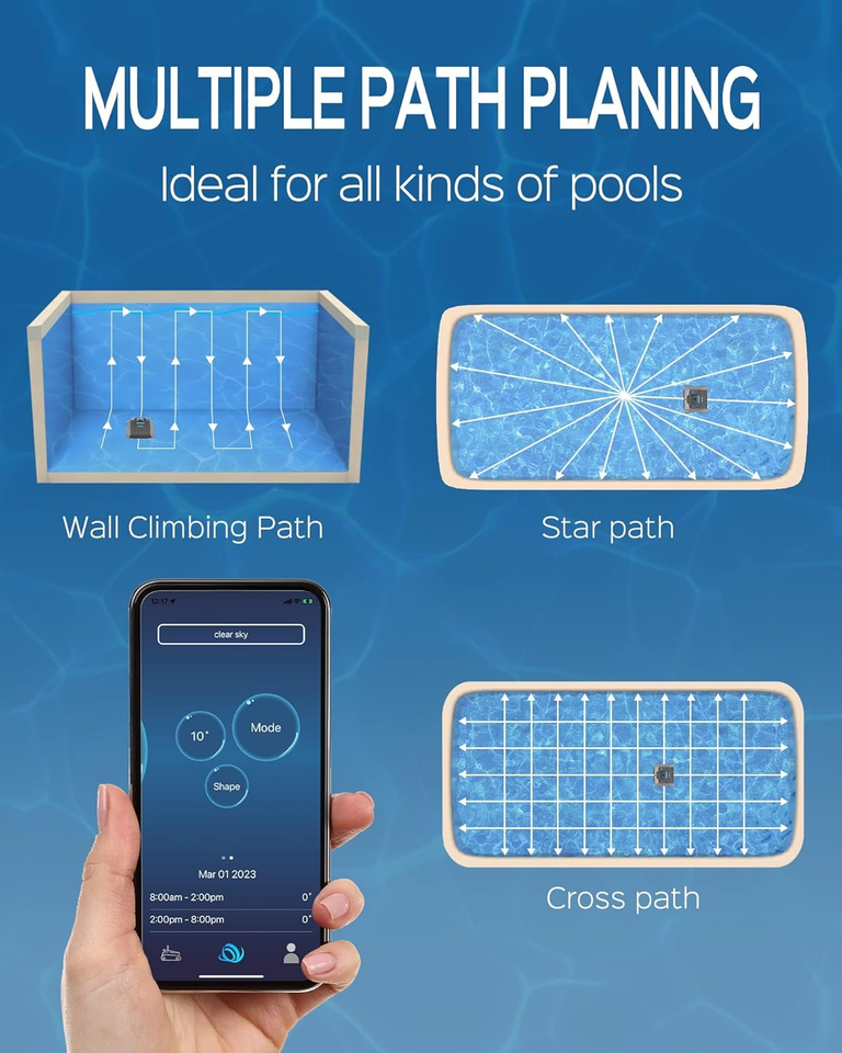 ?The Ultimate Pool Cleaner?Integrated suction, sweeping and scrubbing in one go. Control every element of Osprey 700 Max through the WYBOT app, including an intelligent gyroscope path planning function and setting the cleaning mode(star path/cross path/regular wall-climbing path). It's best to connect the robot and app on the shore and set the cleaning mode first before placing it in the pool.