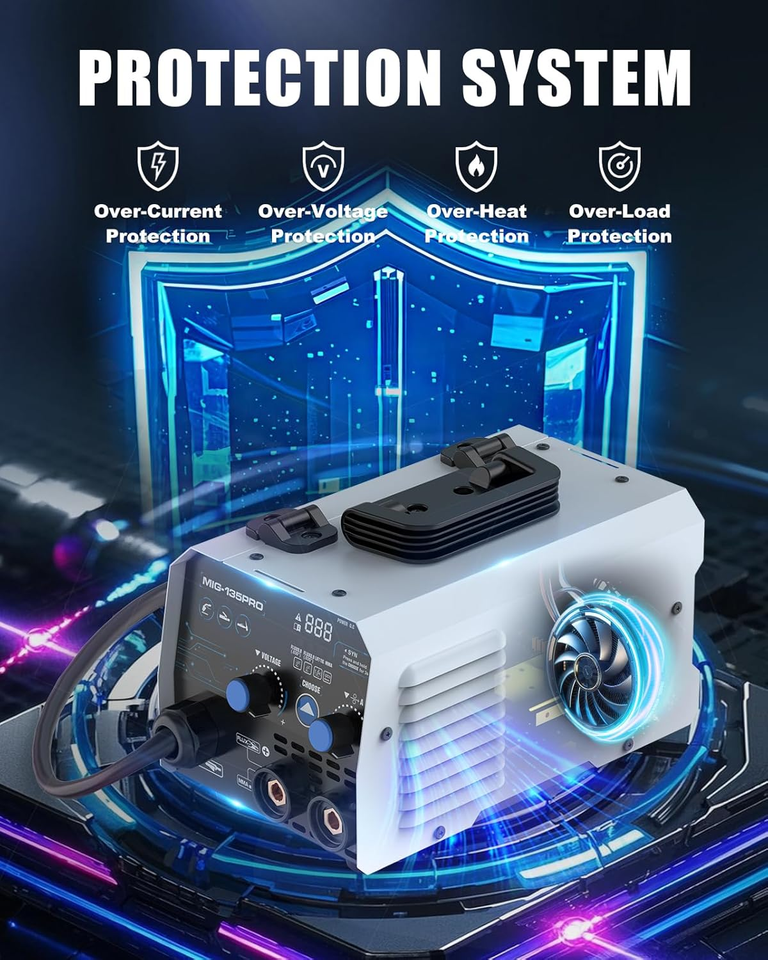 ?ENHANCED SAFETY AND COOLING SYSTEM?: Equipped with an overheat warning system, this MIG welding machine ensures safe operation by a lighted reminder and a pause in the work, if the machine exceeds safe operating temperatures. The built-in efficient cooling fan system further enhances safety by rapidly dissipating heat to maintain optimal performance.