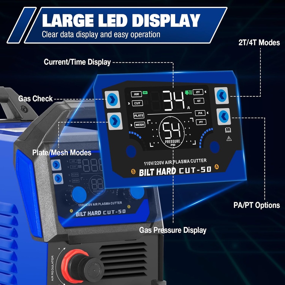 Digital Display Screen ? With both analog and digital displays, the plasma cutter offers easy selection of 2T/4T/PA/PT functions, parameter adjustments, and advanced controls. Post time and pilot arc duration are adjustable from 2 to 10 seconds. The 2T mode is ideal for short, precise cuts, while the 4T mode suits long, continuous cuts to reduce hand fatigue. Plate/Mesh modes ensure cleaner, smoother cuts for both solid and mesh materials.