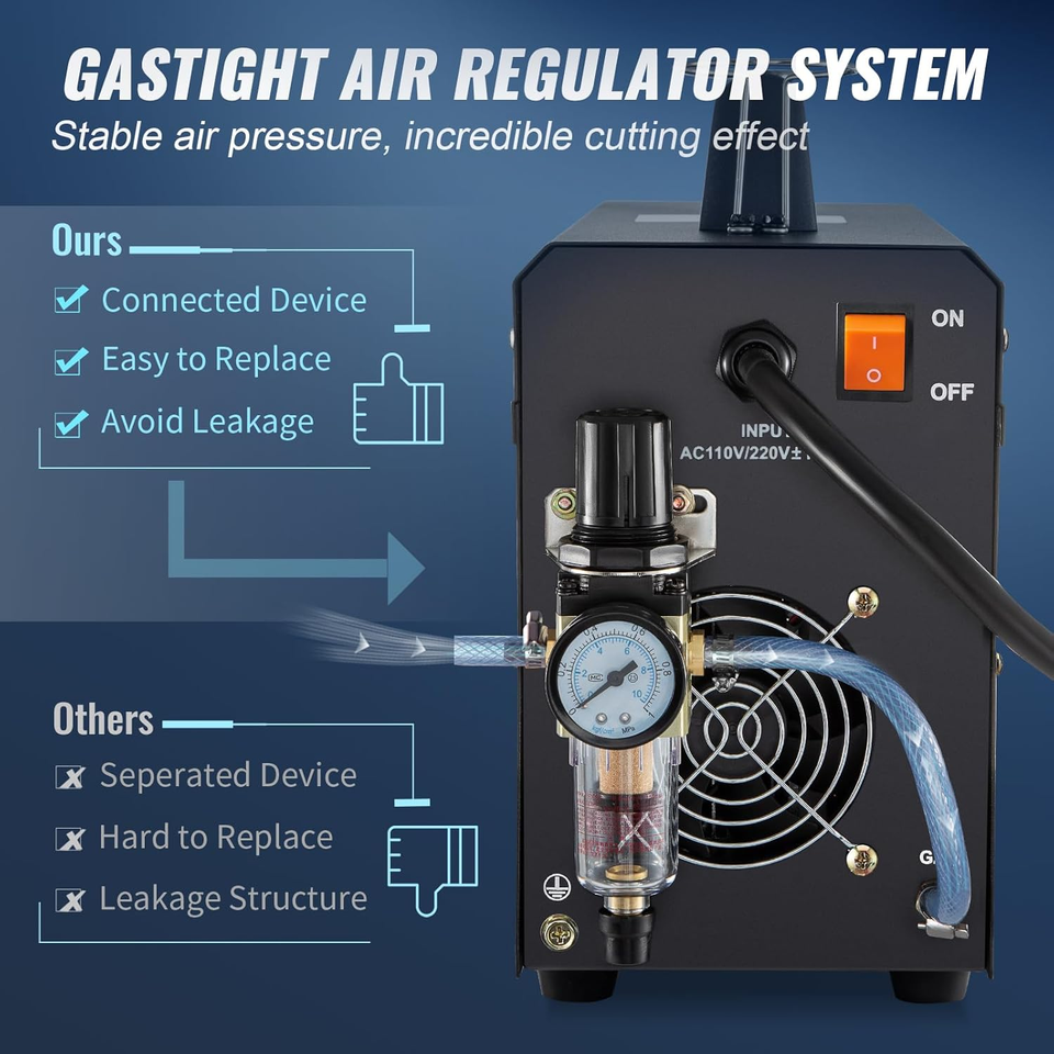 More than You Expected: The extra long 16.4' plasma torch and 6.56' ground clamp with cable offers maximum convenience by extending your working area. Quit wasting time searching for an extension cord and adapter. The kit also includes an air regulator, air hose, 4 hose clamps, 2 cable racks, and some consumables.