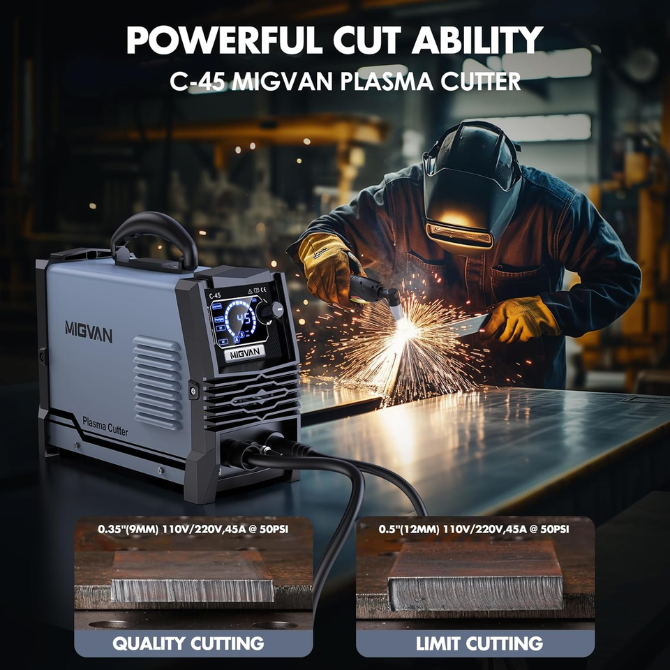 ?Dual-Voltage Powerhouse for Any Project?Switch effortlessly between 110V/220V input with 45A max output, delivering maximum cuts through 12mm steel (0.5") - perfect for home repairs, workshop jobs, and heavy-duty fabrication. Features auto-detect voltage technology for instant switching between household outlets and industrial power sources.