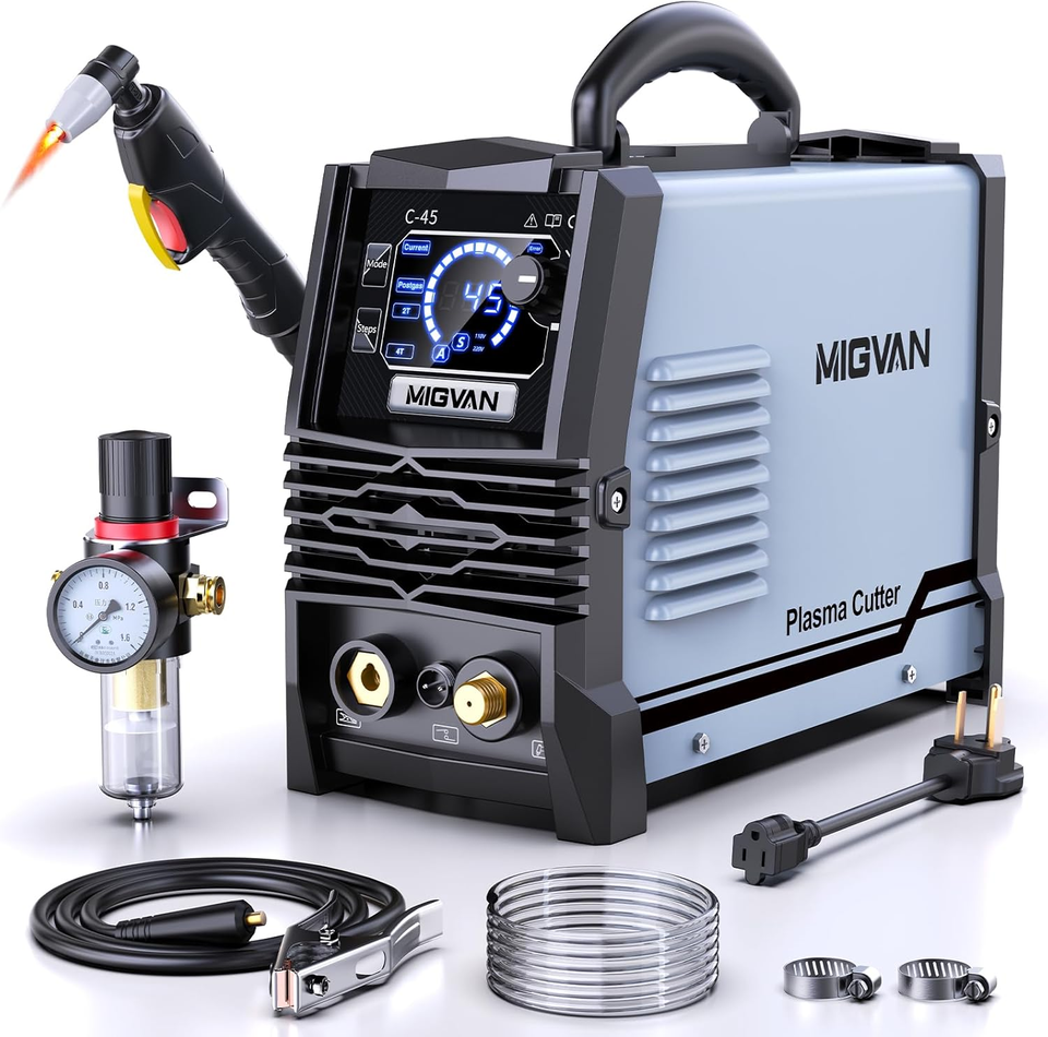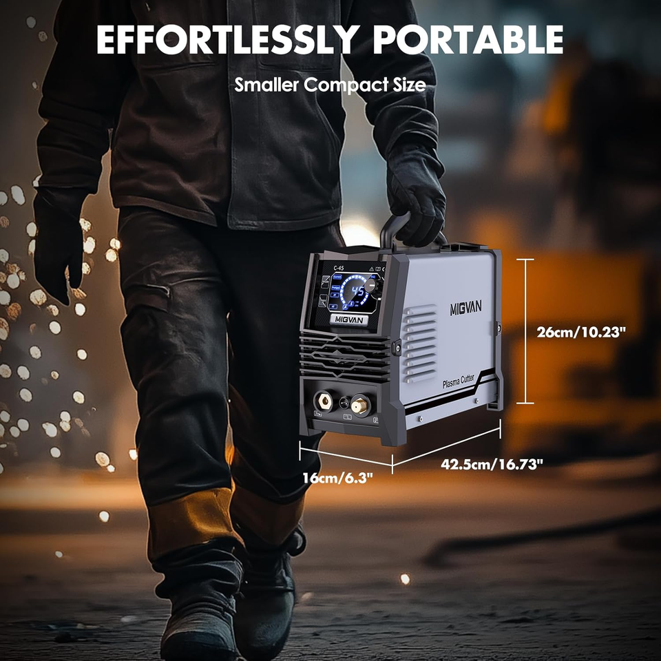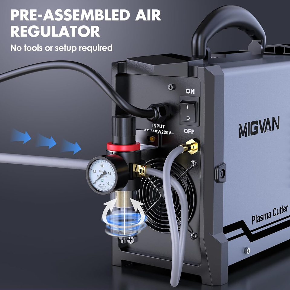 ?Jobsite-Ready in 60 Seconds?Pre-installed air filter/regulator connects to standard compressors with one-tool setup. MIGVAN Plasma cutter torch delivers precision cuts on stainless steel, copper aluminum at optimal 0.4-0.6MPa pressure. Compact size and 14.7lb portable design - lighter than most toolboxes!