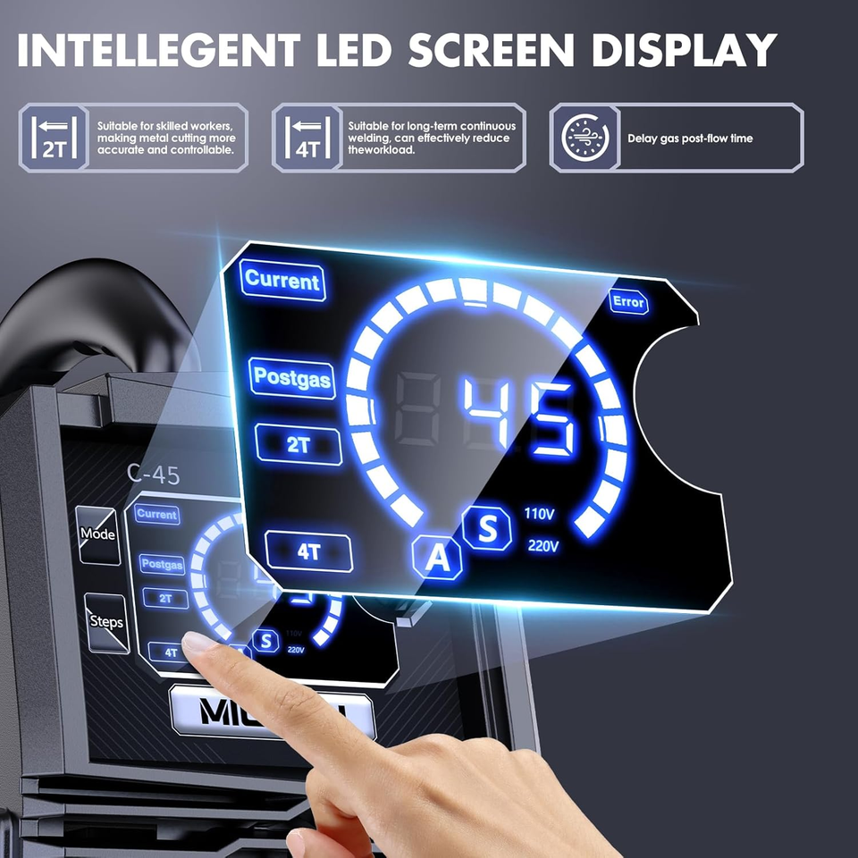 ?Smart-Cut Technology Saves Consumables?Proprietary 2T/4T modes + adjustable post-flow cooling (5-15s) extend consumable life by 30% compared to basic models. The LED digital dashboard displays real-time current/voltage/air pressure while error code diagnostics eliminate guesswork - monitor operations without removing MIGVAN welding helmet!