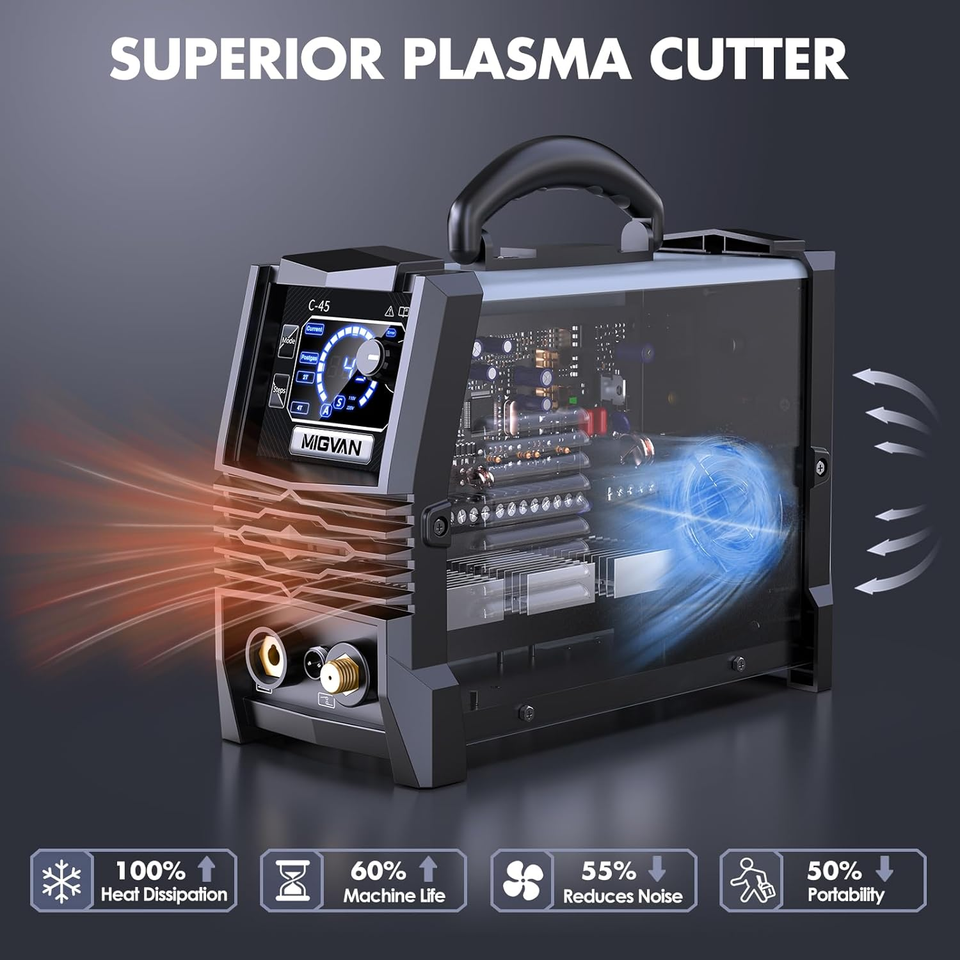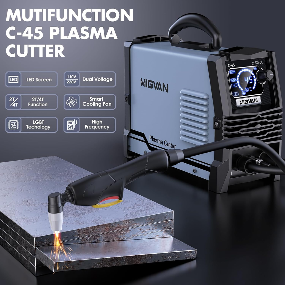 Plasma Cutter, 110/220V Dual Voltage Plasma Cutter Machine with 2T/4T, 45Amps Large LED Screen Display and Post Flow, C-45 Plasma Cutting Machine with IGBT Inverter DC for Beginners and Diyers