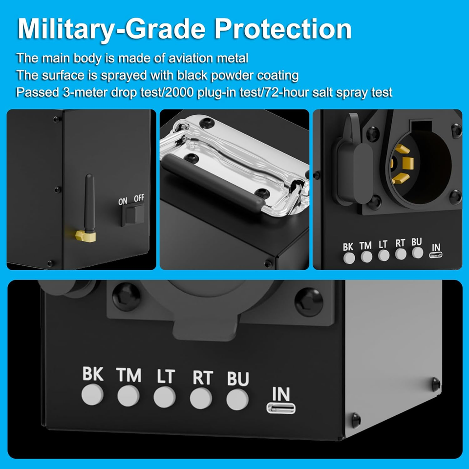 Patent Pending. Wireless Remote Operation: Trailer Tester Box with Battery comes equipped with a wireless remote control, allowing you to operate the tester from a long distance with precision. Say goodbye to the trouble of running back and forth for traditional testing. This makes the trailer light, brake, and brake-away system inspection so fast, very suitable for large parking lots/freight stations, etc.