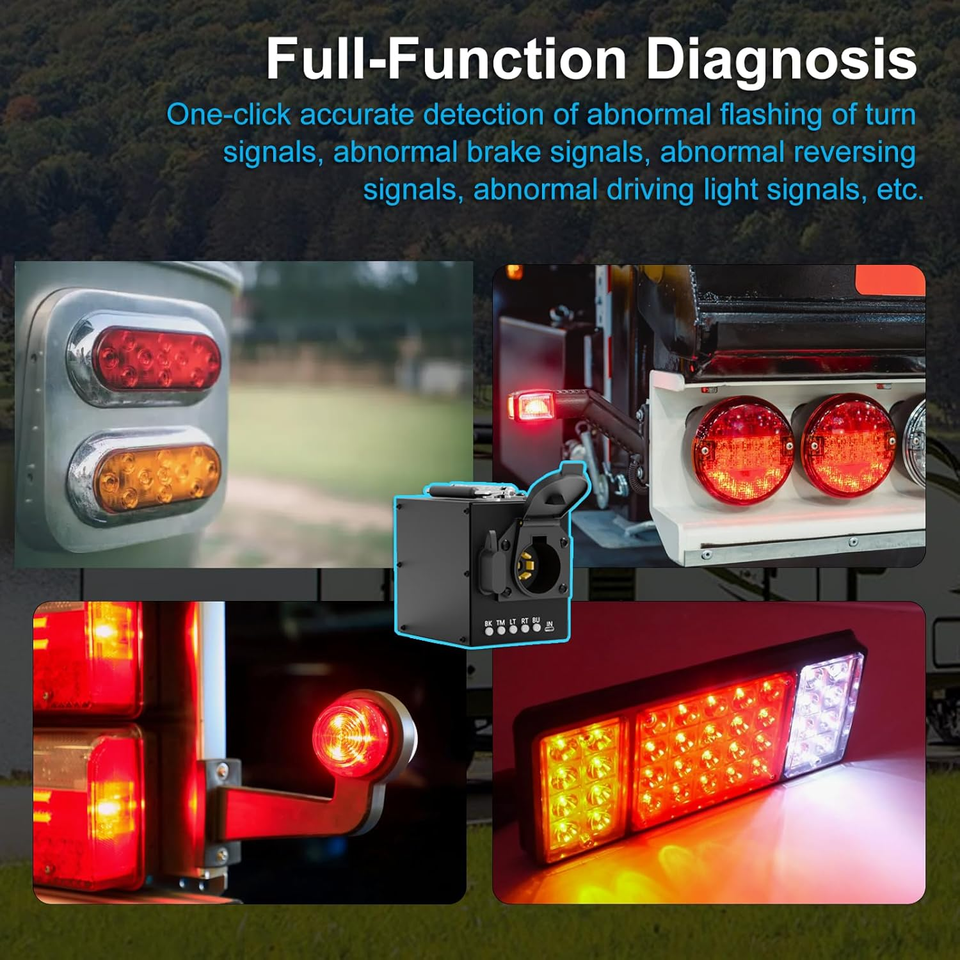 Full-Function Testing: Independent detection module, which can accurately check abnormal turn signal flicker, Abnormal brake signal, Abnormal reversing signal, Abnormal driving light signal, and other faults with one/double click. Accurately checks wiring configurations to ensure the safety and reliability of the trailer?s electrical system.