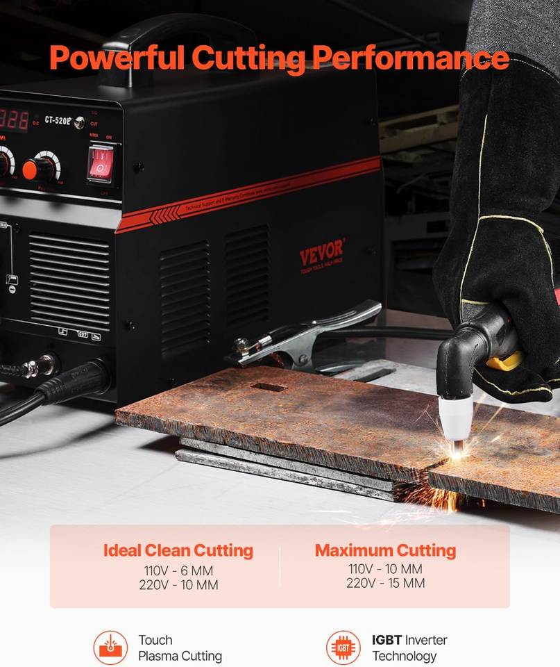 Advanced IGBT Technology: Our CT-520E plasma cutter combo machine adopts the advanced IGBT inverter technology with excellent arc stability. Suitable for welding carbon steel, iron, stainless steel, and other metals. (Friendly Reminder: Not Suitable For Welding Aluminum!)