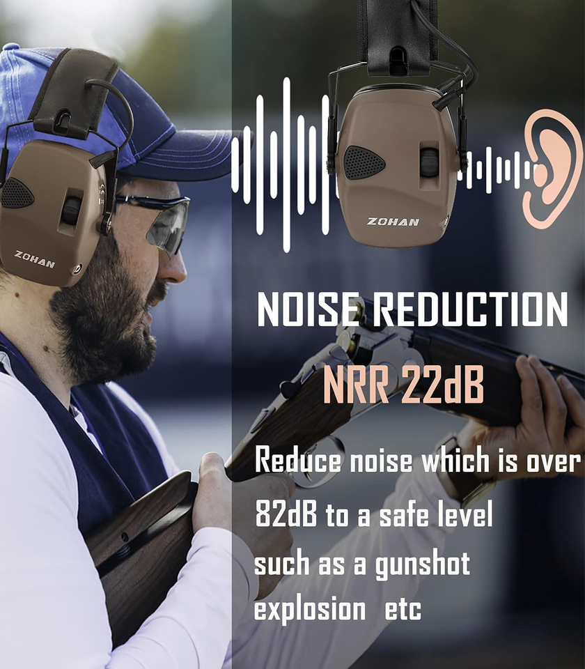 {SHOOTING EARMUFFS} Shooting firearms can generate significant noise, which may permanently damage hearing. The NRR rating of ZOHAN shooting earmuffs is 23dB, compliant with ANSI S3.19 noise reduction standards. They provide a effective barrier to reduce the intensity of sound and protect your ears from potential hearing loss or damage. Especially protect your hearing during shooting, mowing, industrial use and outdoor recreation