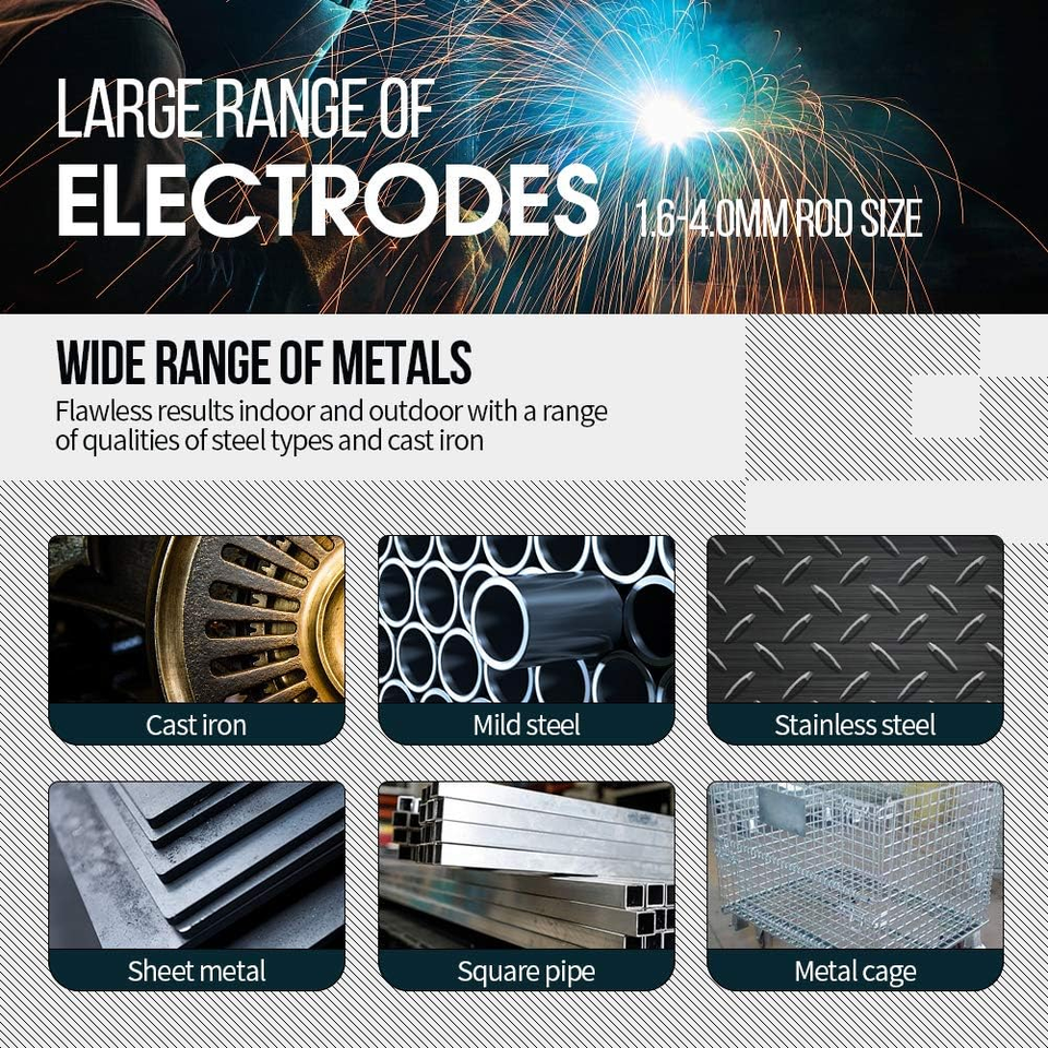 The Arc welder fits below 4.0mm welding rods.Welds all types of iron and iron metals, including carbon steel and medium carbon steel. low splash and smooth joint.
