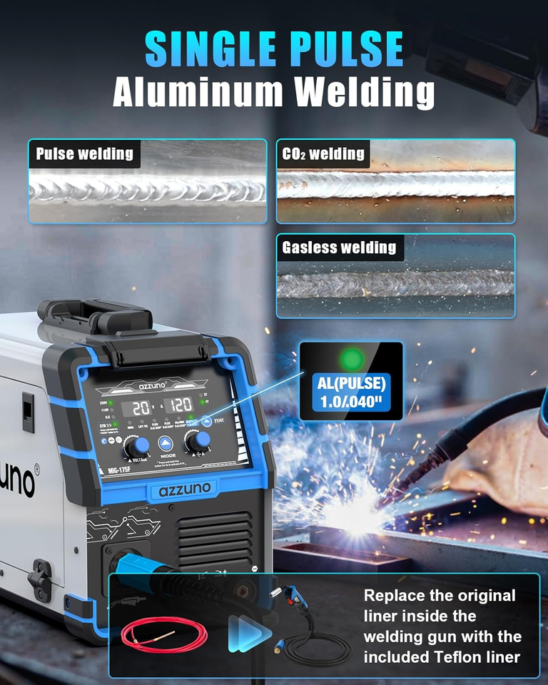 ?MULTIPROCESS ALUMINUM MIG WELDER?: The AZZUNO MIG-175F Welder offers versatile welding capabilities with modes Flux Core MIG, Gas MIG, PULSE Aluminum MIG, Stick, and Lift TIG. With just 2 buttons and 2 knobs, all welding operations can be easily performed.