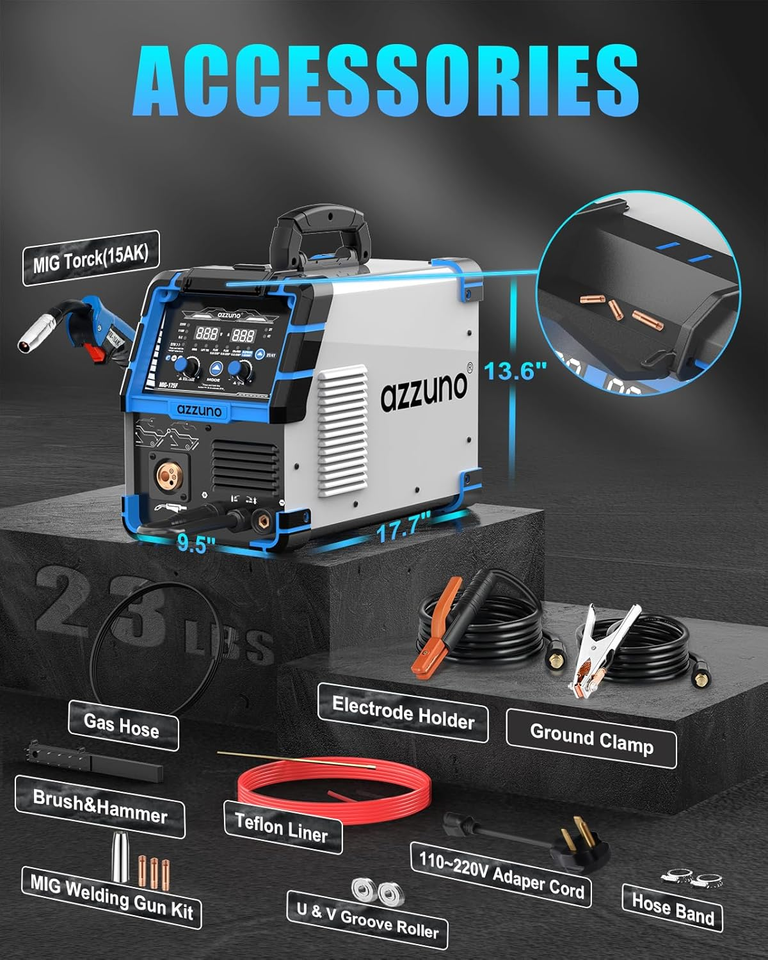 ?DIMENSIONS?: 17.7"*9.5"*13.6" 23LBS ?PACKAGE INCLUDED?: AZZUNO Aluminum Welder Machine*1, 15AK MIG Torch*1, Electrode Holder*1, Ground Clamp*1, 110V~220V Adapter*1, Brush Hammer*1, Gas Hose*1, Hose Band*2, Drive Roller*2, Contact Tip*3, Gas Nozzle*1, Teflon Liner*1, User Manual*1.