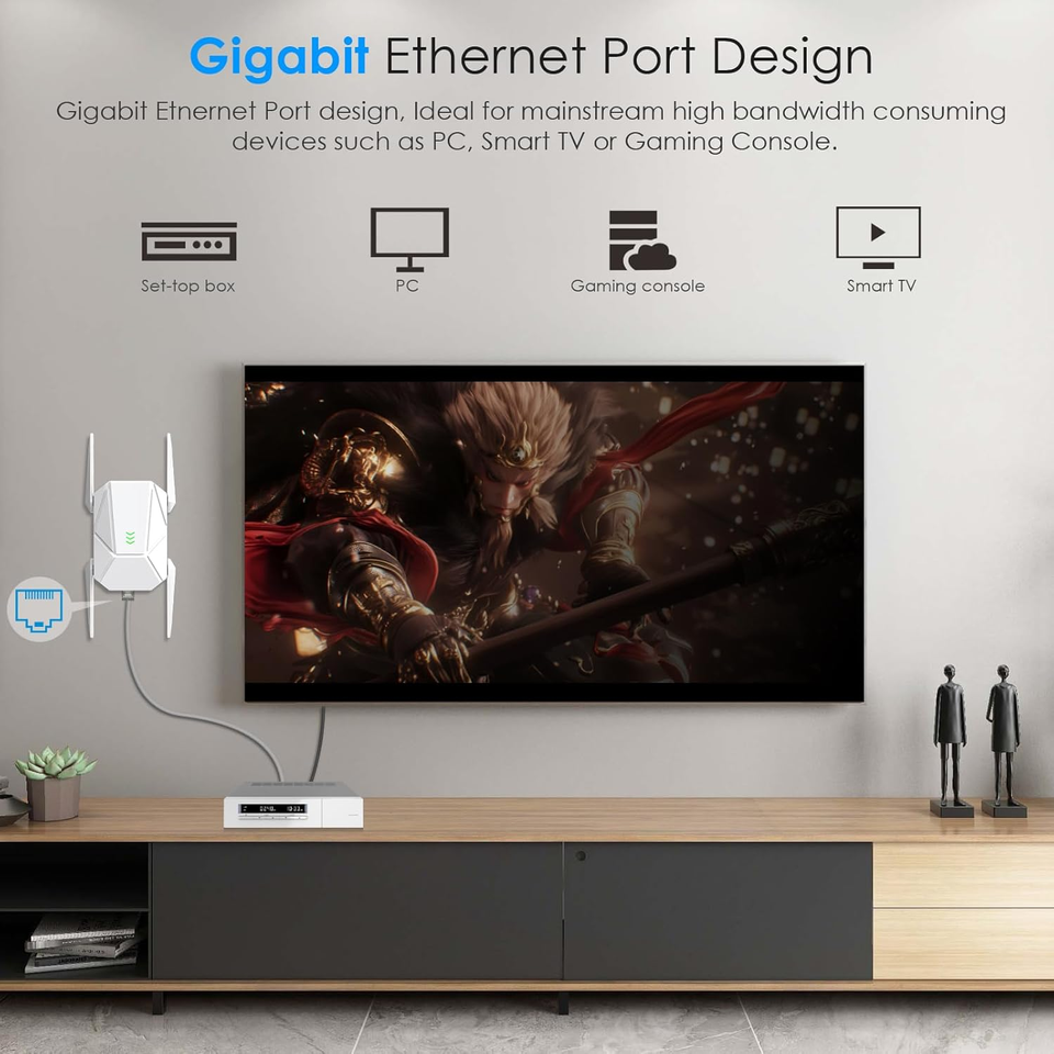 Gigabit Port for Wired Stability: Use the WiFi booster built-in gigabit Ethernet port to connect devices like smart TVs and gaming consoles, ensuring low-latency, high-speed wired connections.