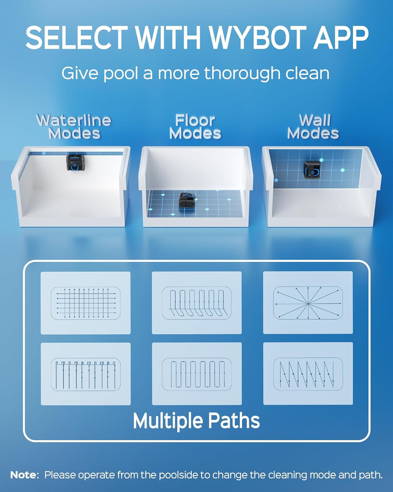 Cordless Pool Robot with App Setting: Our app offers a variety of cleaning modes and paths. You can choose from floor mode, waterline mode, combination mode, and up to 6 different cleaning paths to meet the specific cleaning needs of your pool. Note: Please change the cleaning mode of the robot when onshore.
