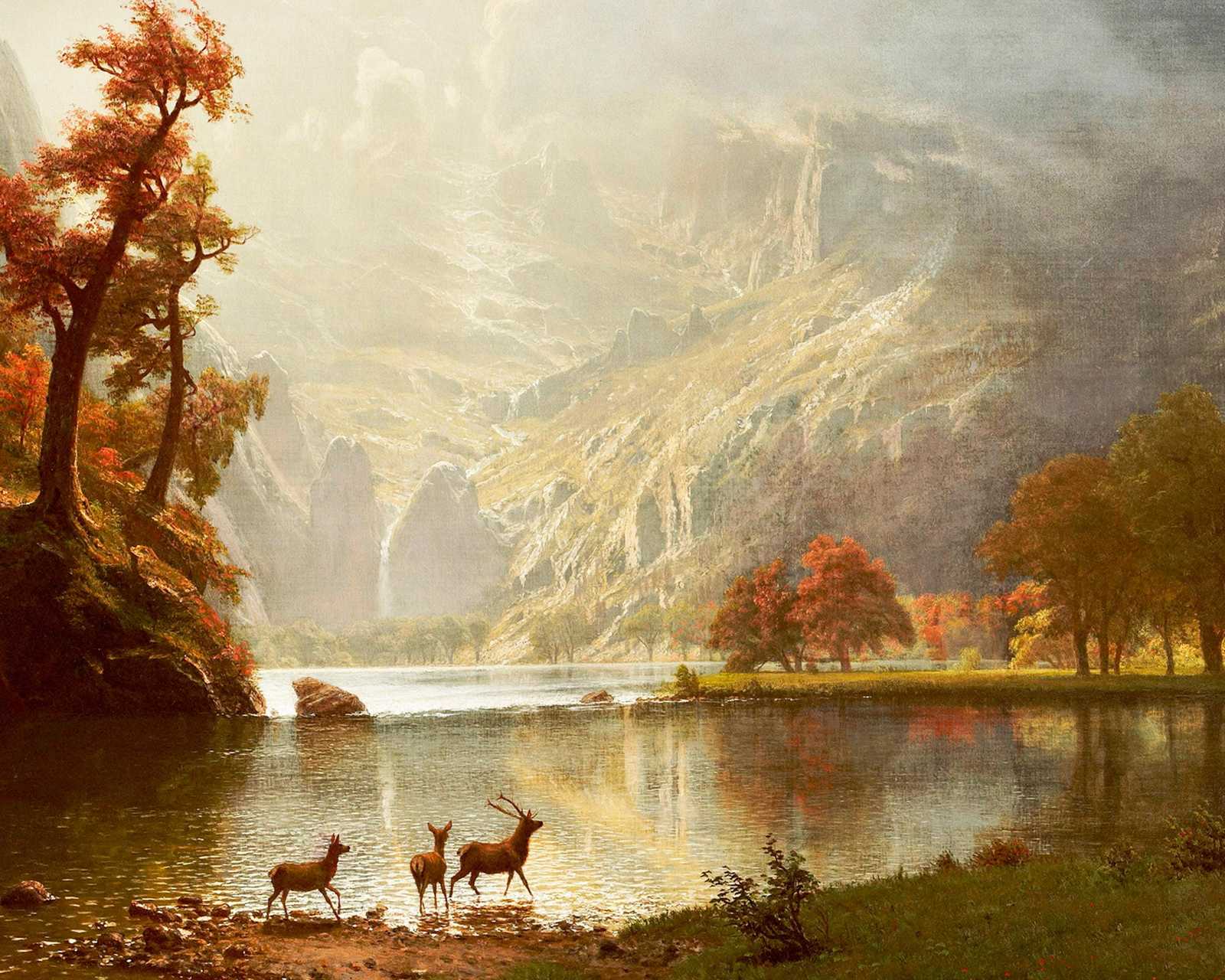 The Sierra Nevada, Albert Bierstadt 1868 Print, Vintage Oil Painting, Deer Herd