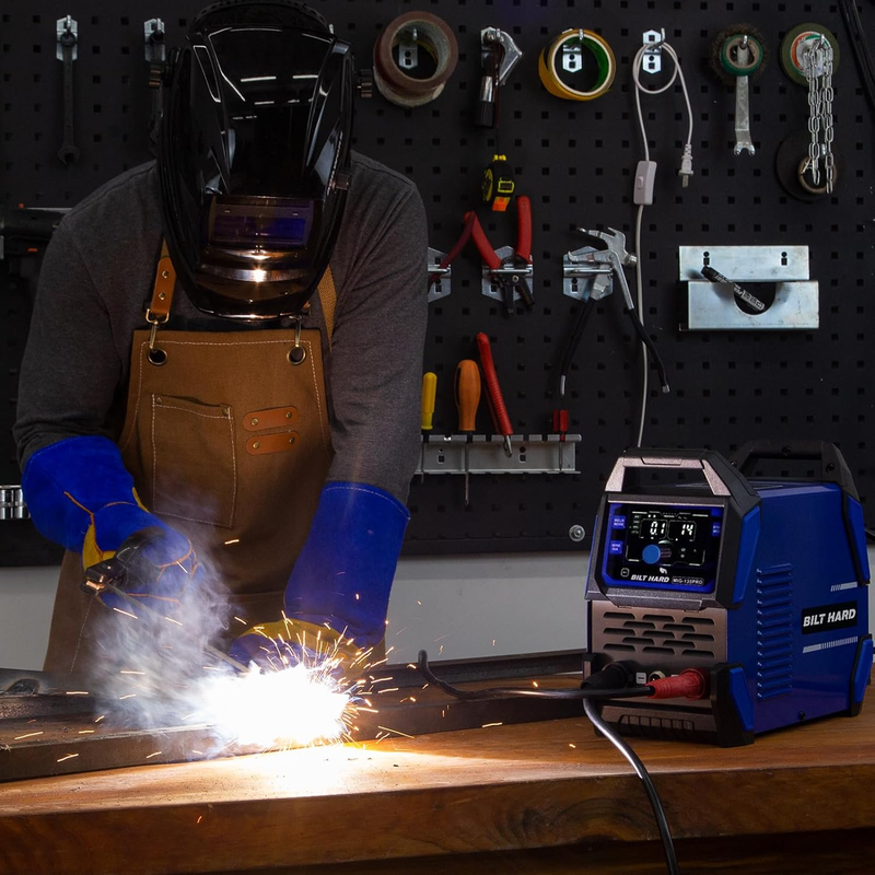Ready to Weld: BILT HARD provides a full set of accessories for you, including solar-powered helmet, 6.6ft MIG Gun (pre-installed 0.030" tip), 10ft Ground Clamp, 2lb Flux Core Wire, Spare 0.035" Tip, Gloves, Brush Hammer. Just start welding right out of the box.
