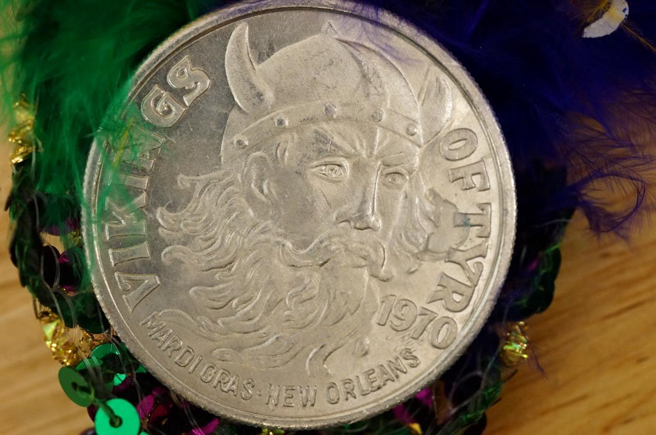 Vintage Costume Jewelry Jester Brooch New Orleans MARDI GRAS 1970 Parade Coin