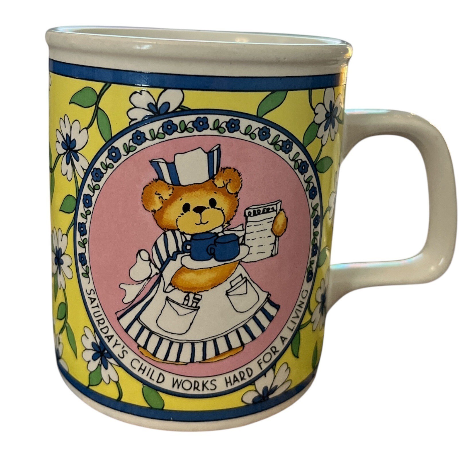 Celebrate the charm of vintage collectibles with this 1986 ?Saturday?s Child? ceramic mug from the beloved *Lucy Me* line by Lucy Rigg for Enesco. Featuring an adorable teddy bear waitress illustration and the phrase ?Saturday?s Child Works Hard for a Living,? this mug is accented with a floral border and soft pastel tones. The interior includes a sweet surprise message: ?Saturday?s Child? with pink heart details.