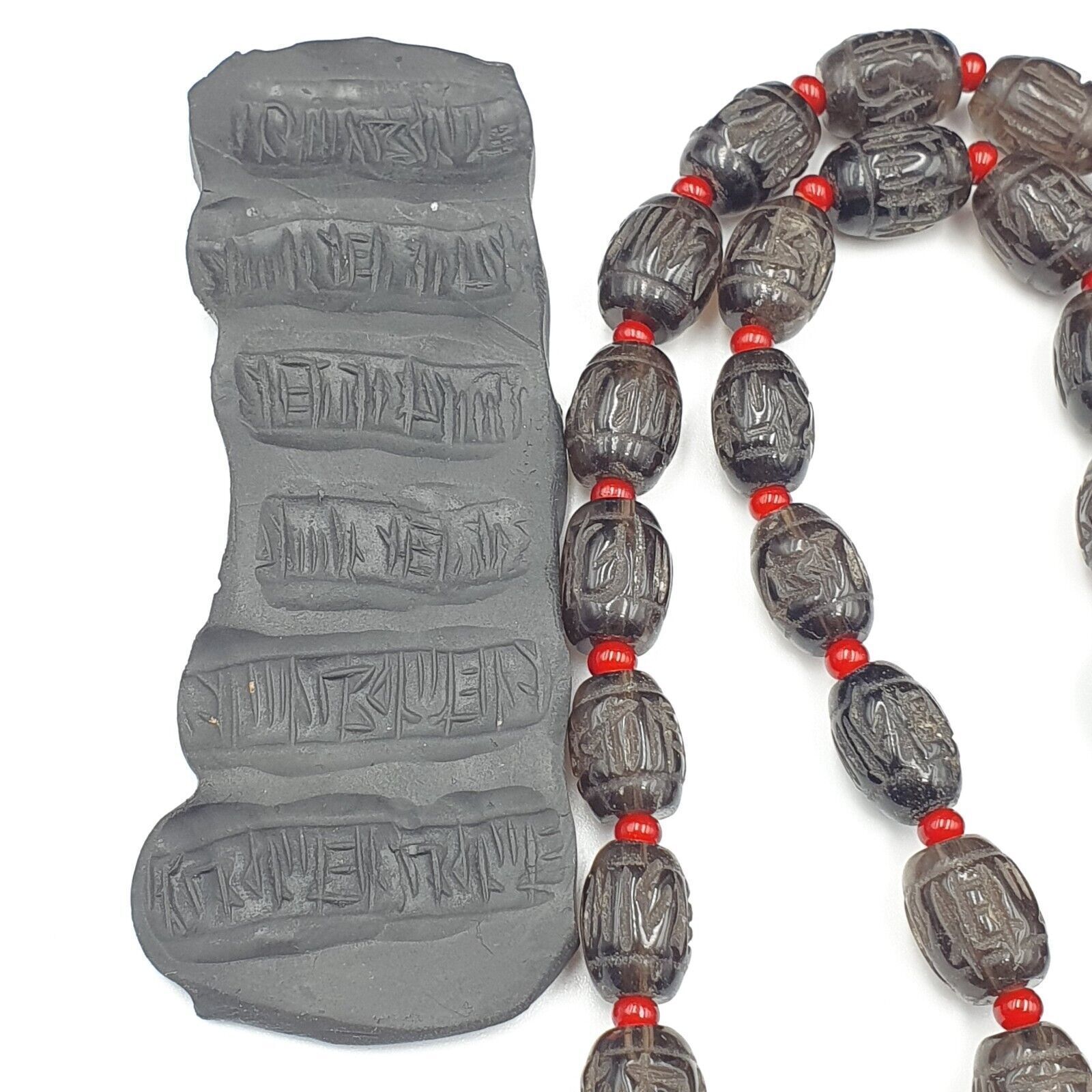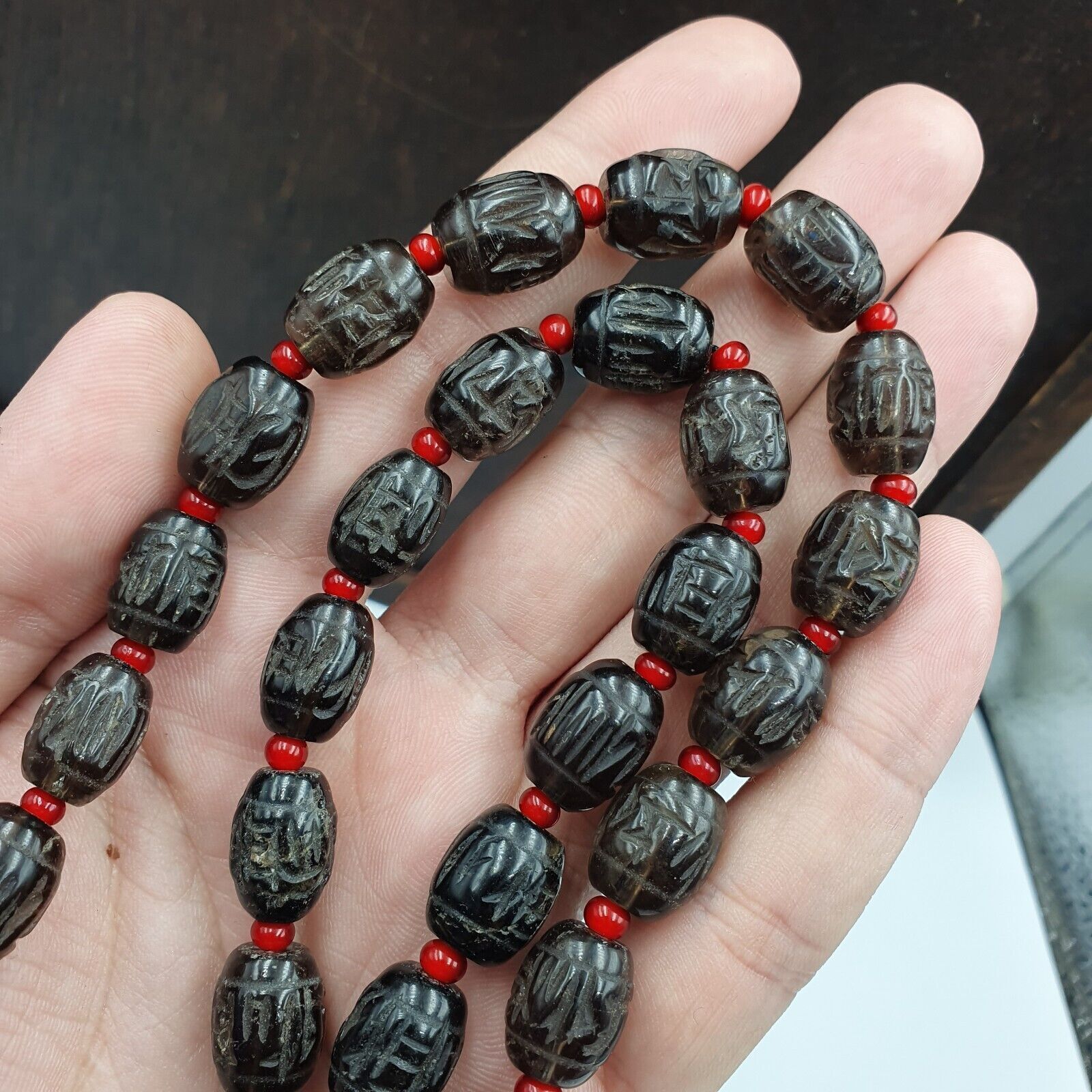 ANTIGUO TIBETANO ANTIGUO Tallado Cuarzo Ahumado CUENTAS MALA COLLAR SMK-2
