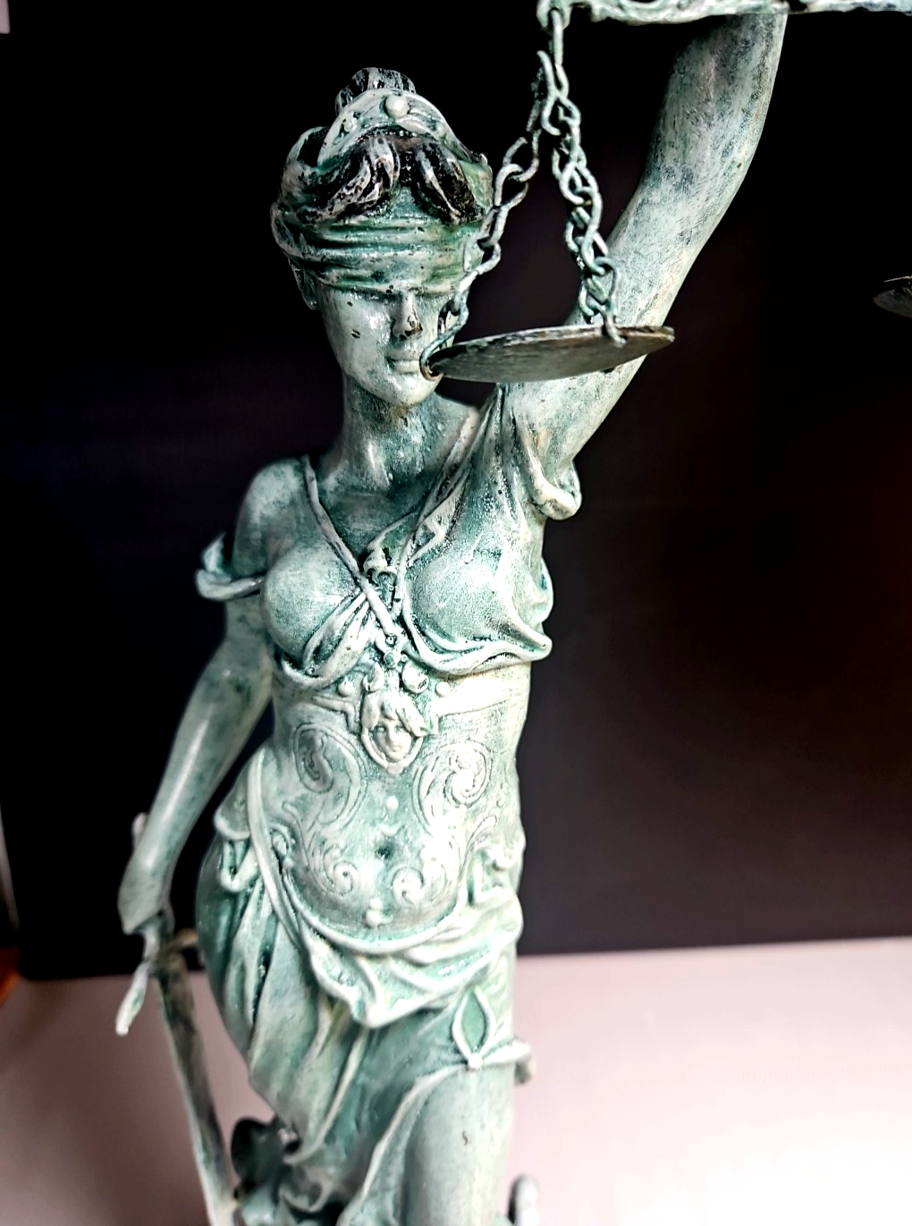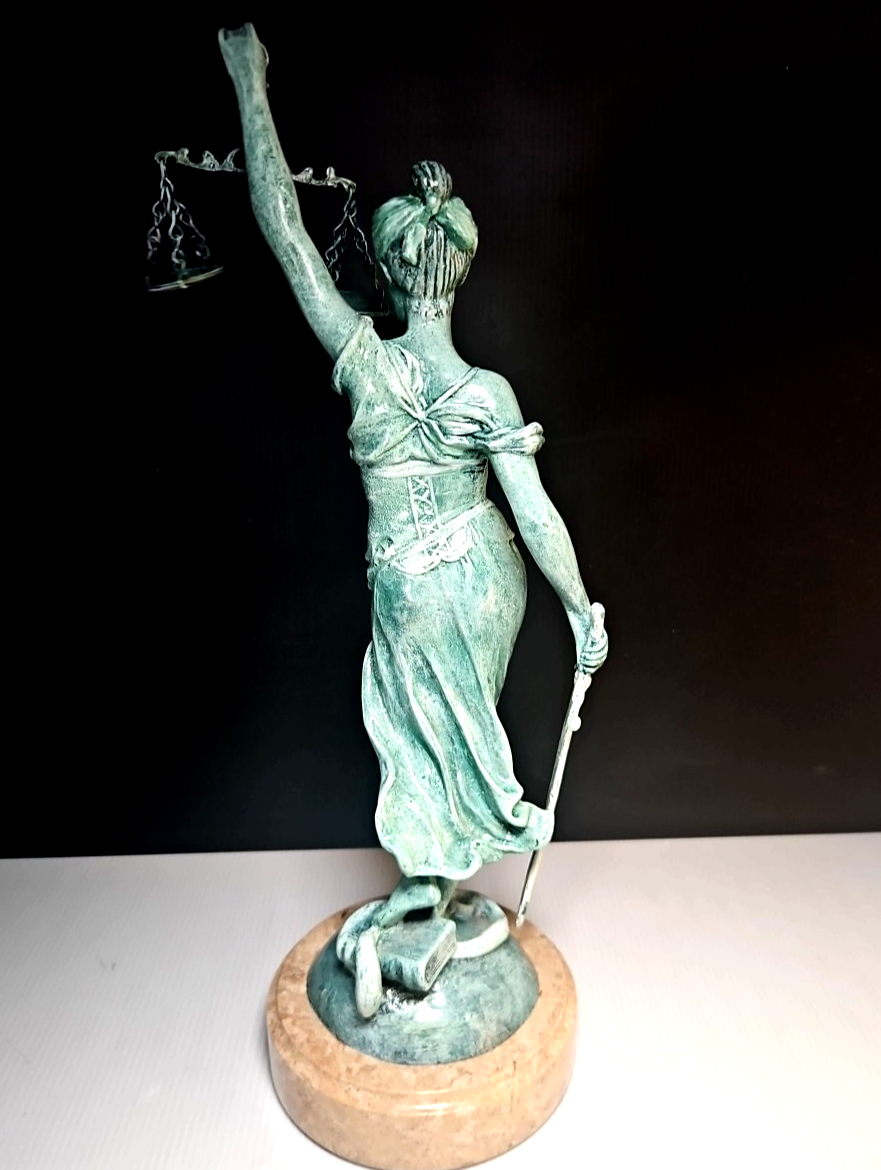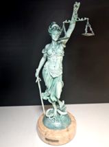 The statue features a blindfolded Lady Justice holding scales and a sword, standing atop a coiled serpent and law book?symbols of impartiality, law, and wisdom. The statue rests on a solid marble base and has a rich green patina-like finish applied during production.