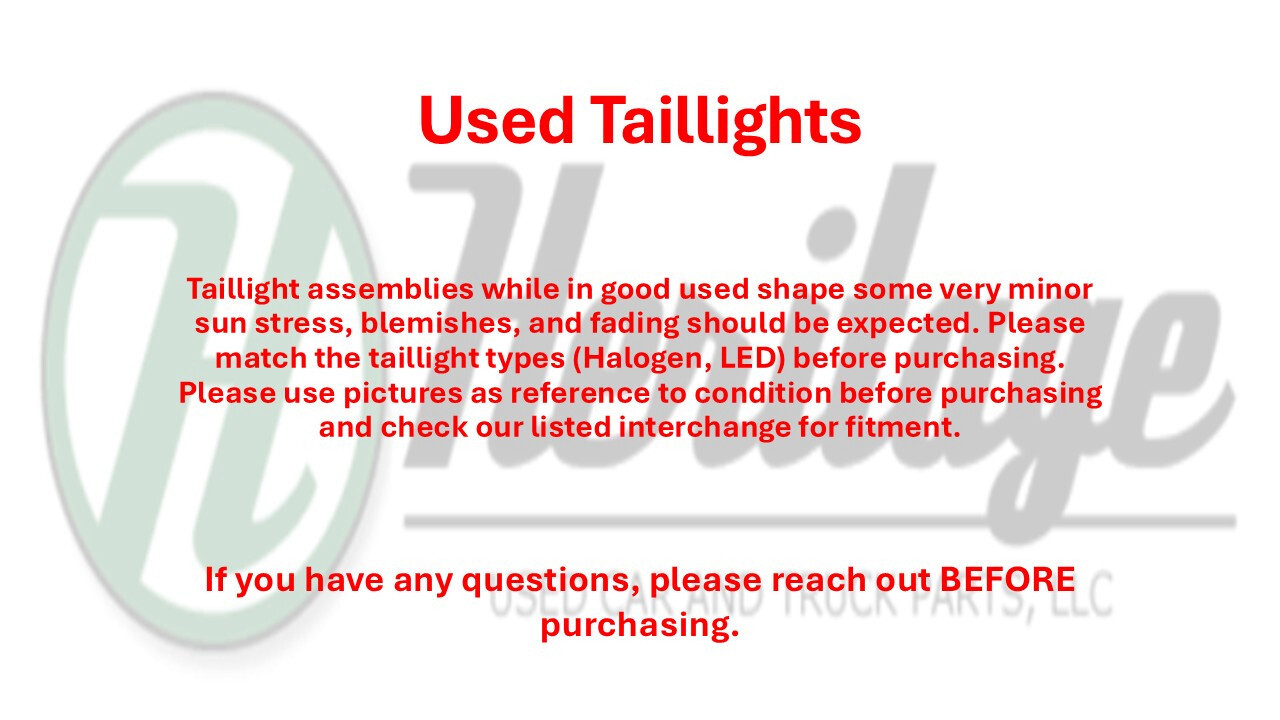 Some vehicles have different specs that must be matched to ensure fit. If you have any questions about if this part will fit your vehicle, please call or text 251-375-2135 Used Taillight. Please refer to photos for condition. While in good used shape, some very minor sun stress, blemishes, and fading should be expected.