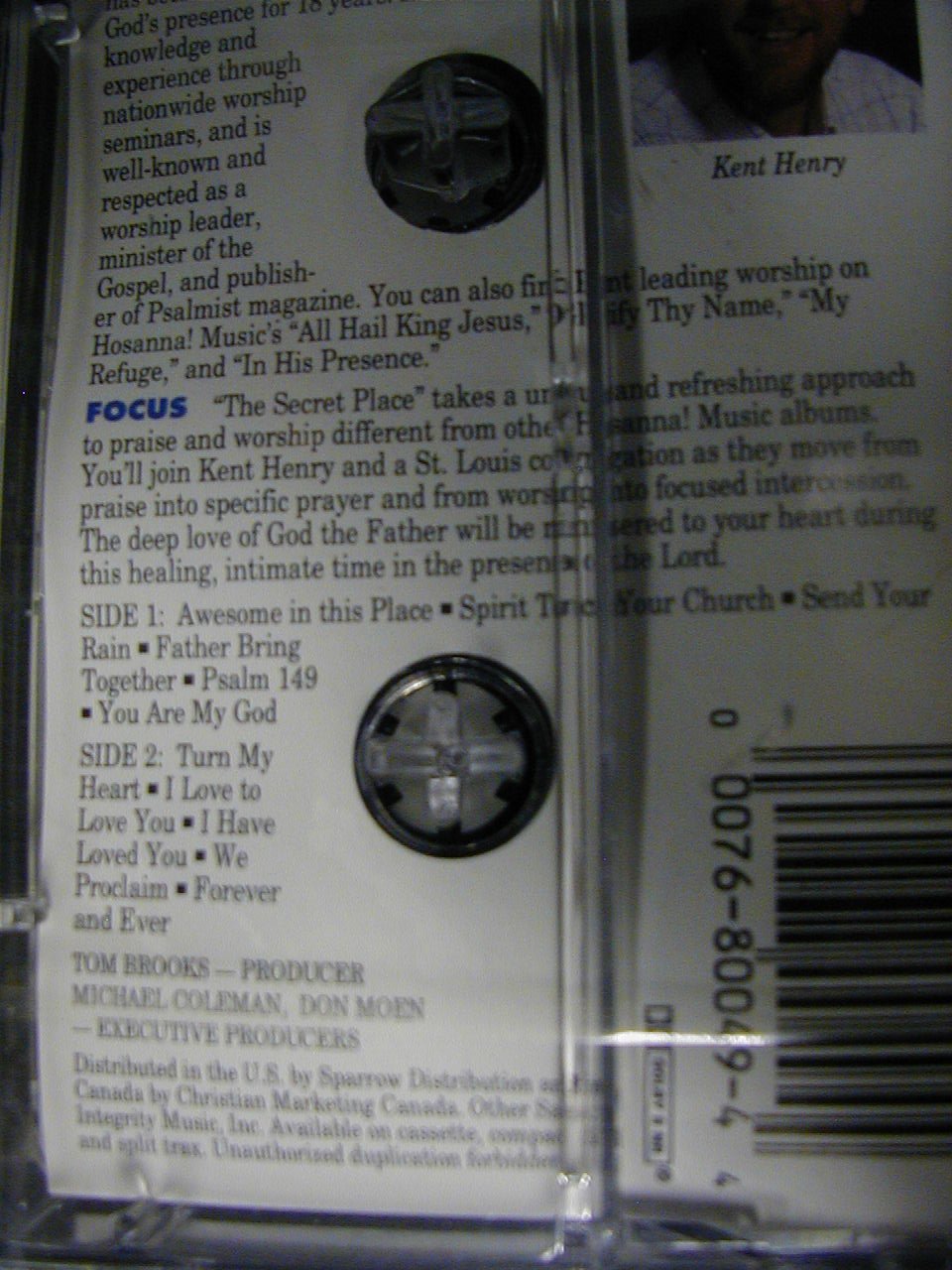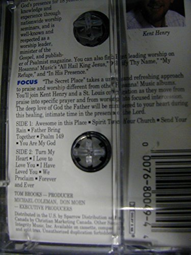 Product description: "The Secret Place" takes a unique and refreshing approach to praise and worship different from other Hosanna! Music albums. You'll join Kent Henry and a St. Louis congregation as they move from praise into specific prayer and from worship into focused intercession. The deep love of God the Father will be ministered to your heart during this healing, intimate time in the presence of the Lord. /// Track Listing: 1. Awesome In This Place 2. Spirit Touch Your Church 3. Send Your Rain 4. Father Bring Together 5. Psalm 149 6. You Are My God 7. Turn My Heart 8. I Love To Love You 9. I Have Loved You 10. We Proclaim 11. Forever And Ever