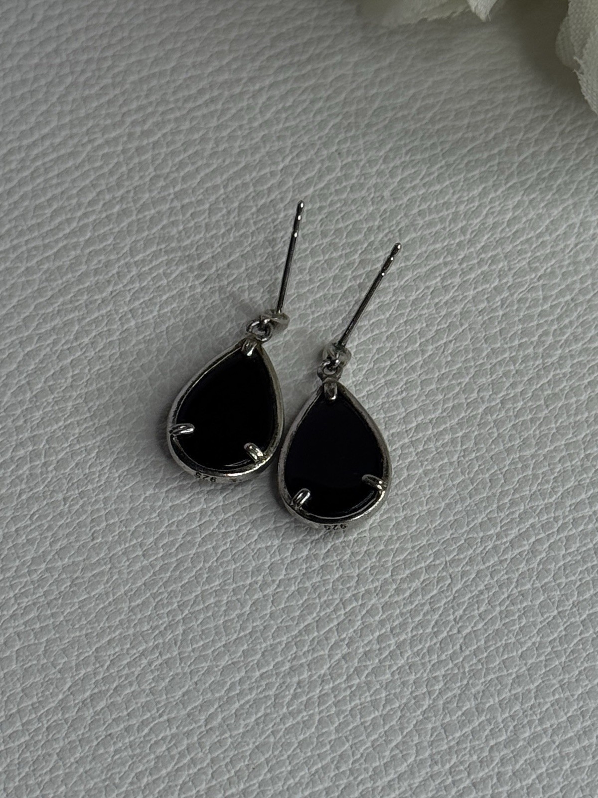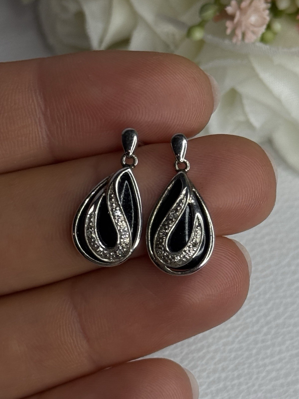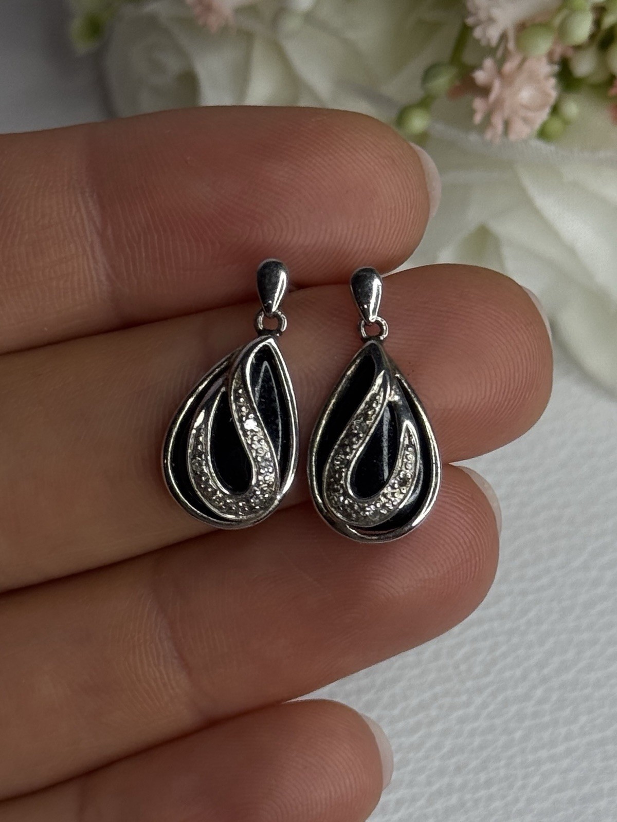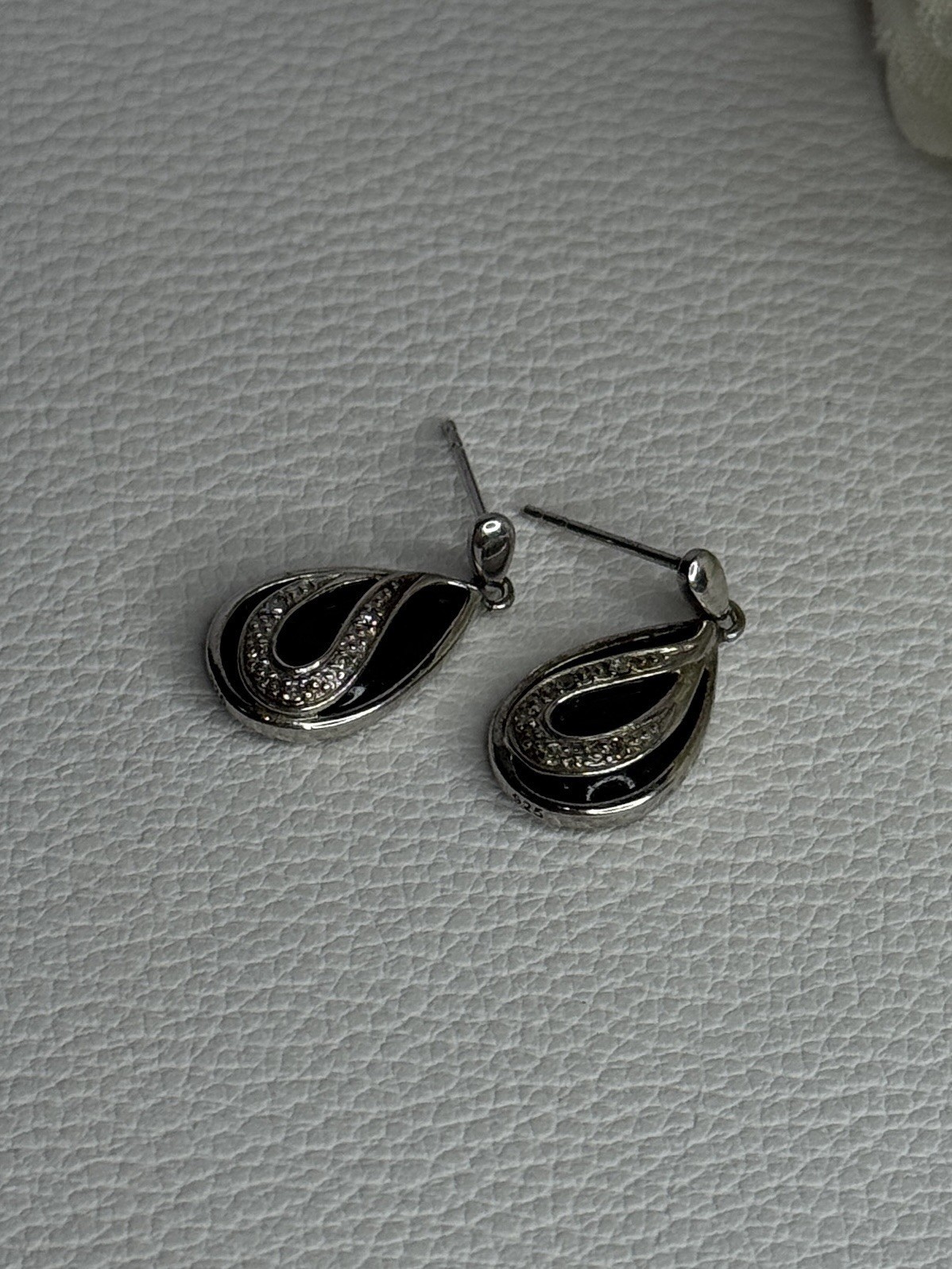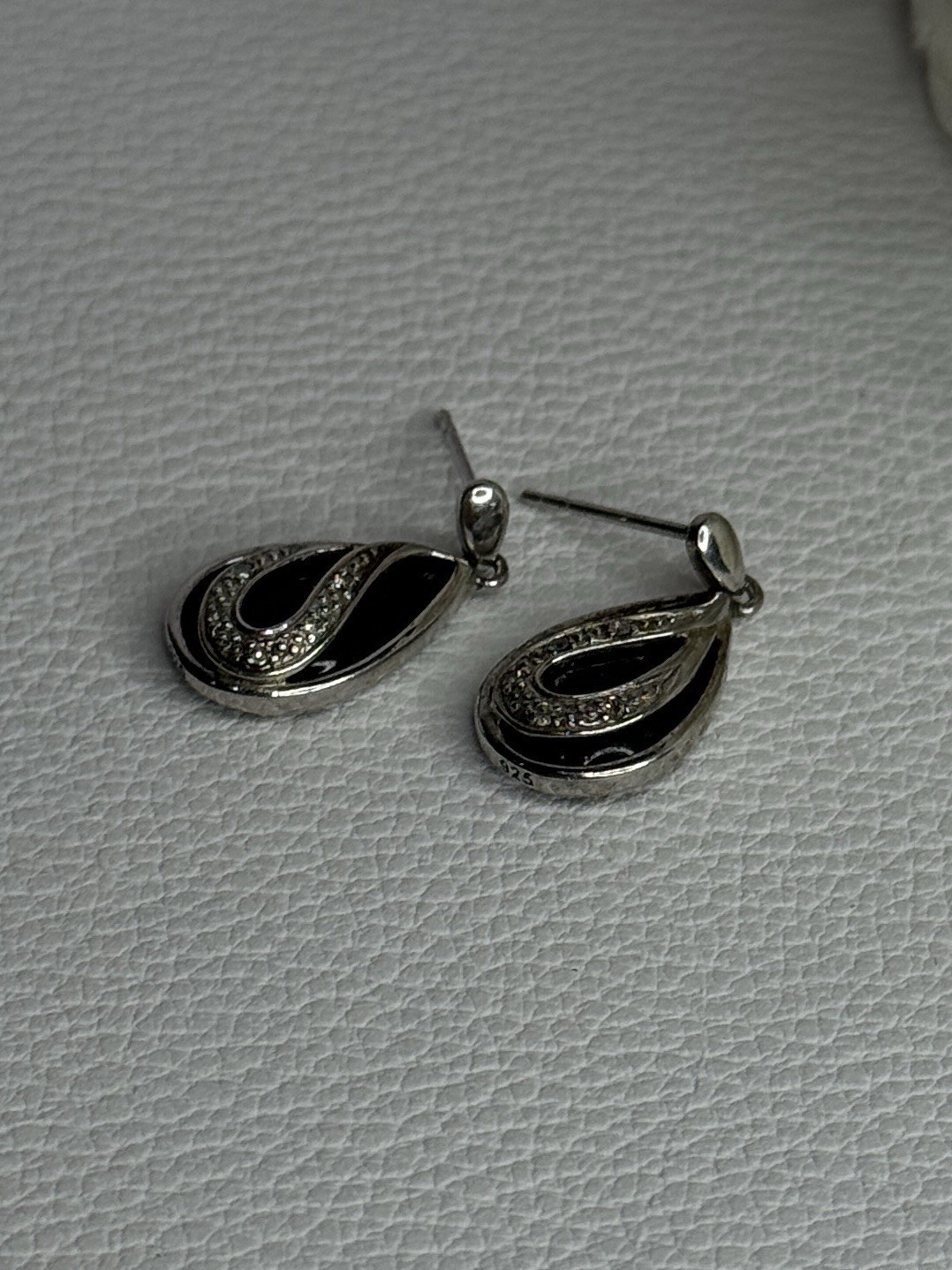 ELEGANT 925 STERLING SILVER BLACK ONYX & DIAMONDS EARRINGS LENGTH 0.80 INCH