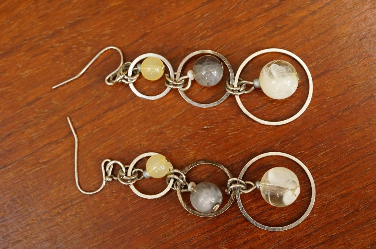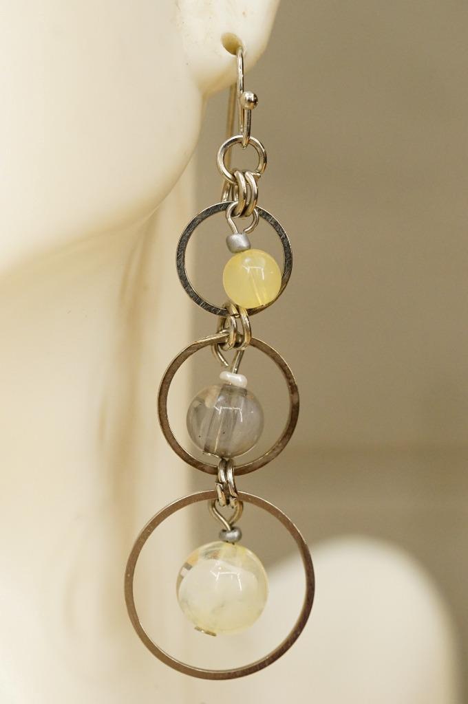 Vintage Costume Jewelry Pierced Earrings Dangle Silvertone Circle Link Beaded - measures 2.5" long. Pale yellow and gray tone beads.