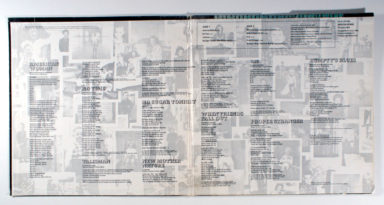 American Woman, by The Guess Who, was the last to feature lead guitarist Randy Bachman until a reformation effort in 1983. The album peaked at no. 9 on the Billboard Pop Albums chart. It stayed on the charts for over a year and was their most successful release with over 20 million copies sold. In addition to the title cut (the group's most successful song), this album also includes the no. 1 American and Canadian single No Sugar Tonight/New Mother Nature, as well as a remake of No Time, a song the group previously recorded for Canned Wheat. The newer version was released as a single and is the one most familiar to listeners. The album's musical styles consists of psychedelic rock and hard rock.