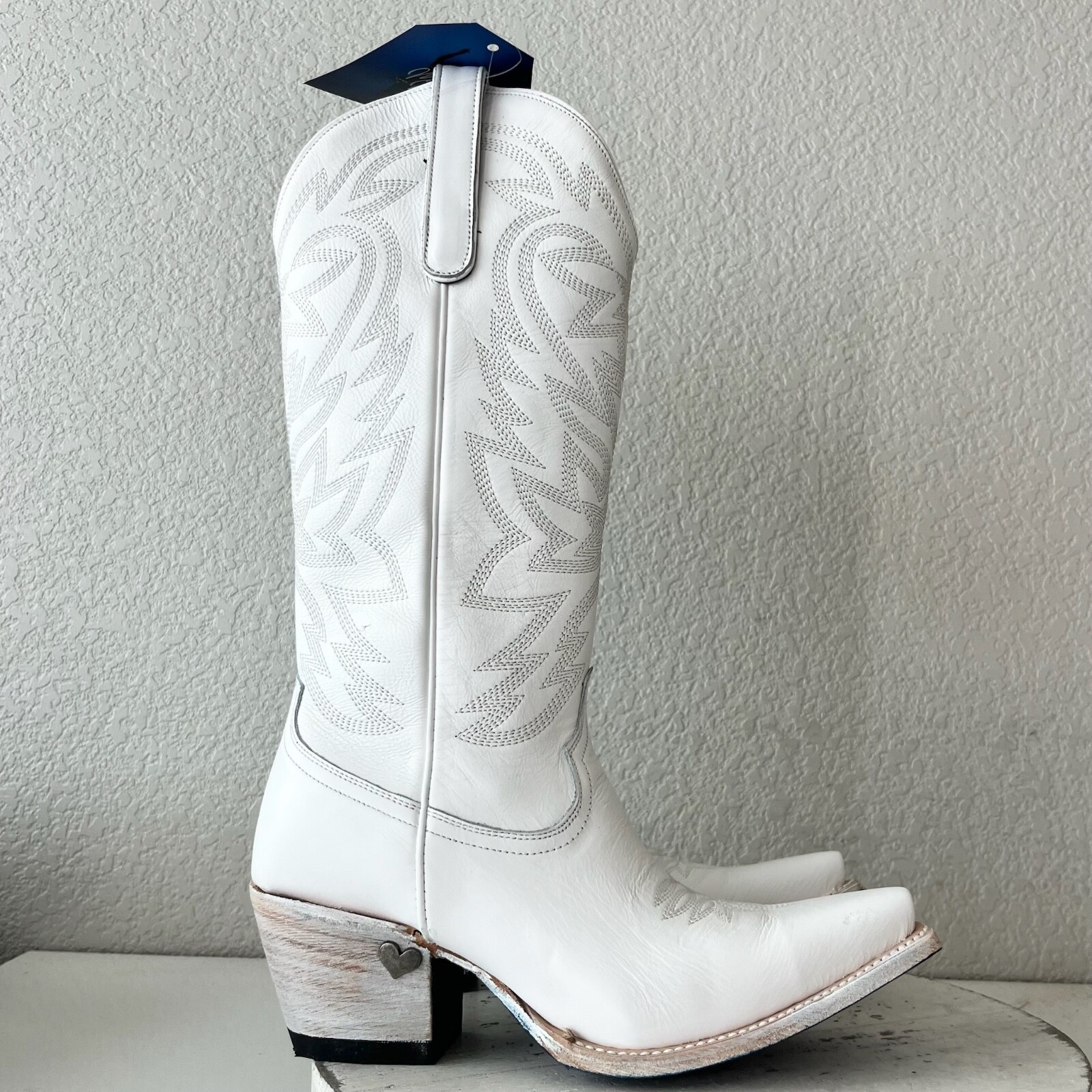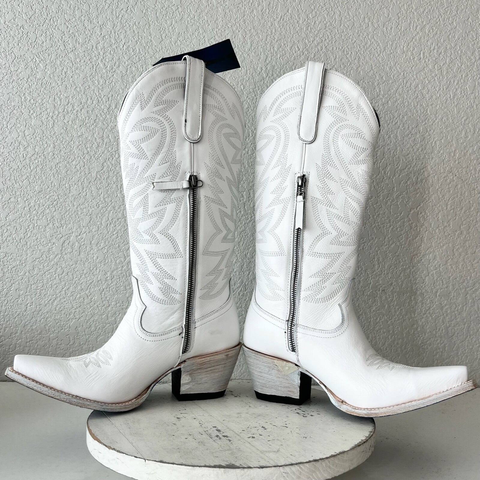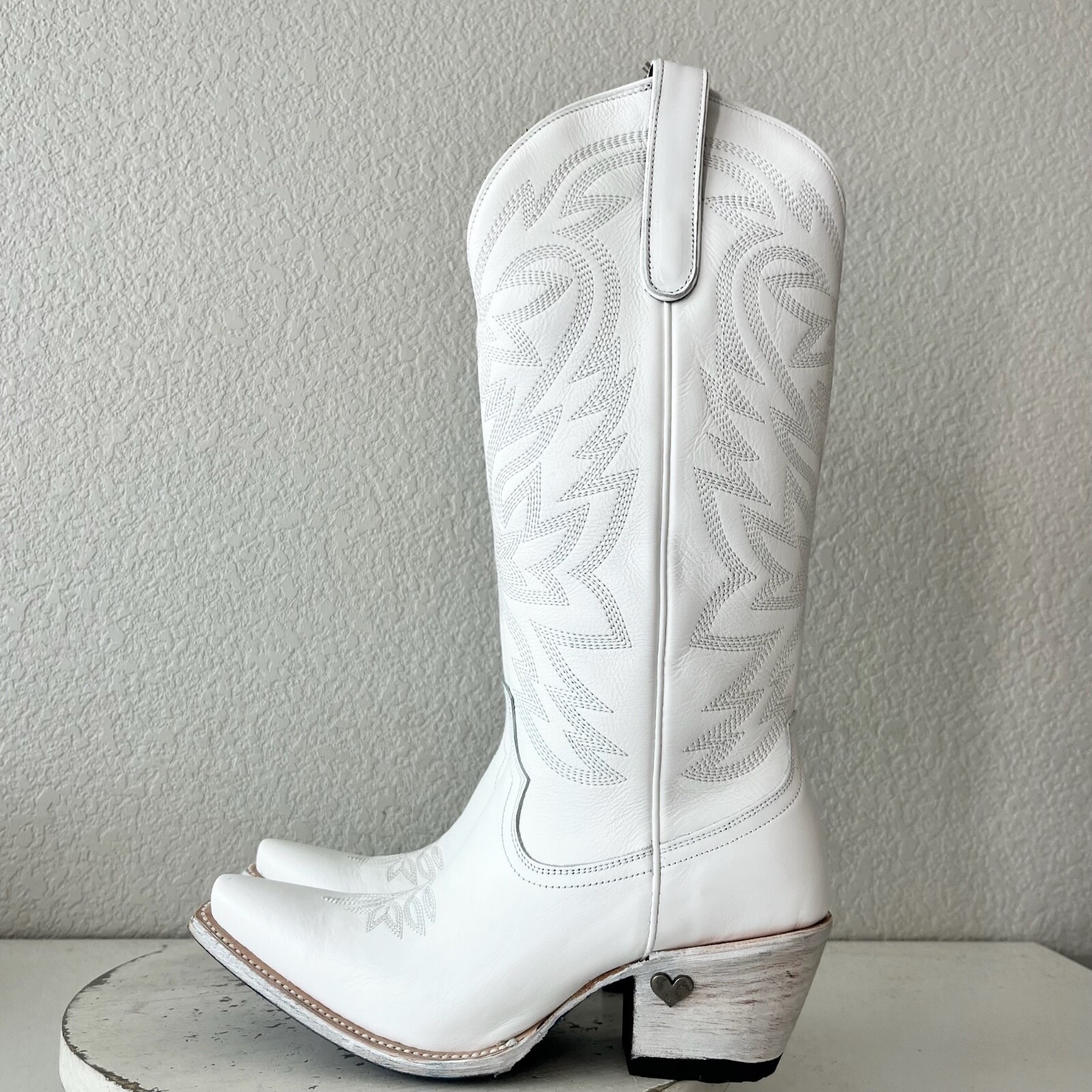 Lane Boots Collab with MEGAN MORONEY SMOKESHOW Womens Cowboy Boots in Matte White Leather with a Western Snip Toe, 15" Mid Calf Tall shaft with Zipper Closure