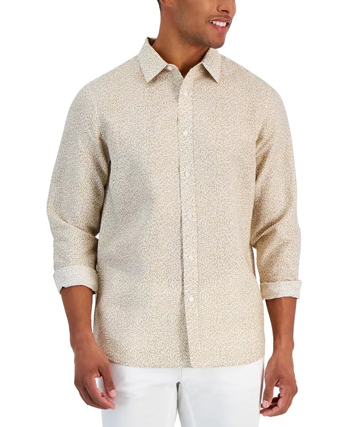 Michael Kors Men's Classic-Fit Leaf Print Long Sleeve Shirt-Khaki-Small