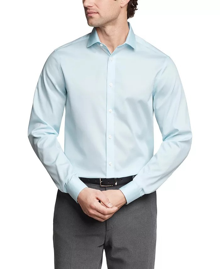 The Calvin Klein steel dress shirt is engineered for performance. High-tech wrinkle-free stretch fabric requires less ironing, while wicking properties pull away moisture for cool, dry comfort. A slim fit delivers a tailored look that defines refinement.