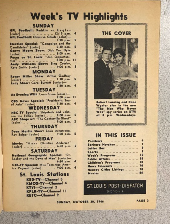 TV MAGAZINE St. Louis (MO) Post-Dispatch October 30, 1966 Robert Lansing cover