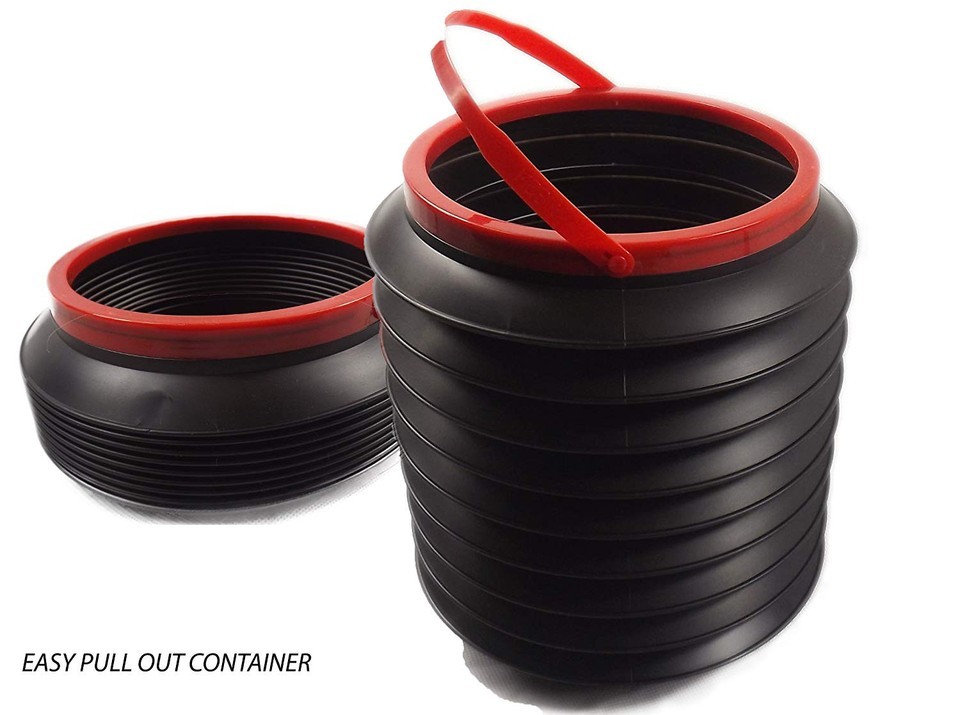 Black container with red handle Fold-able design for easy storage, Perfect for Holiday or camping trips, Can easily fit in a small Bag!
