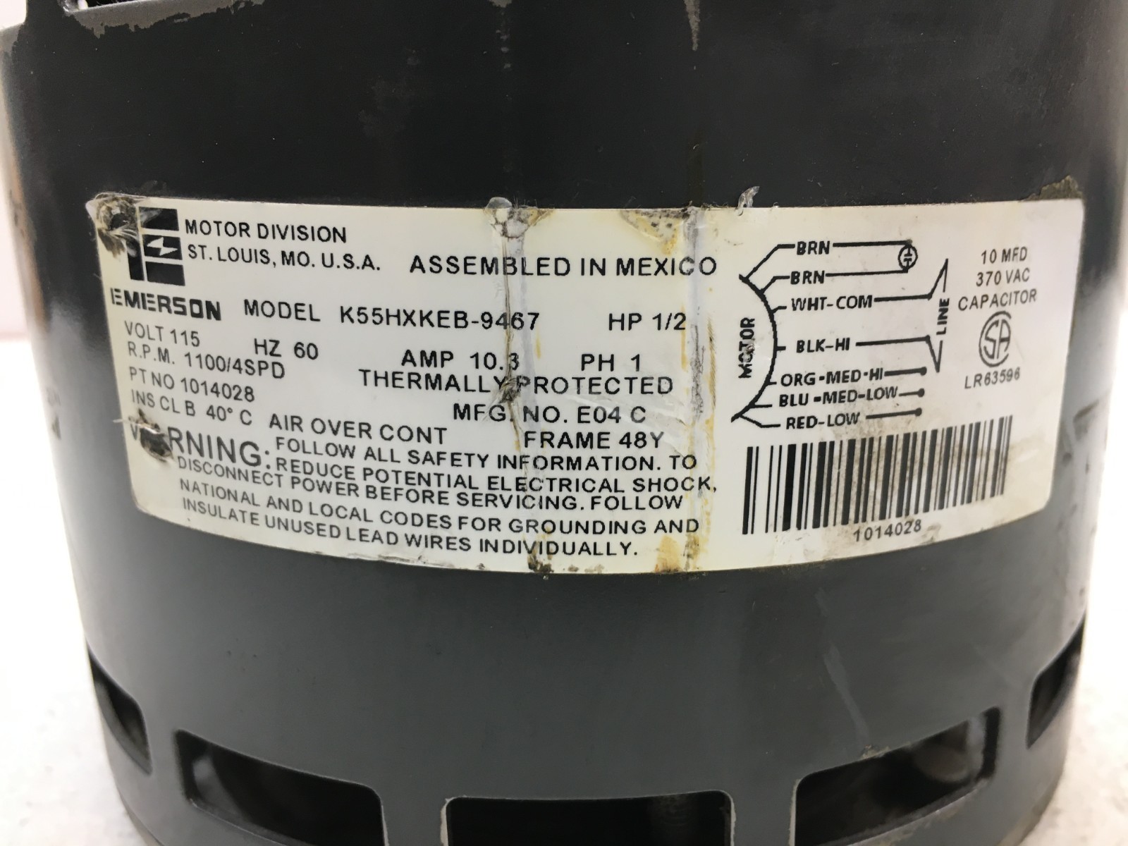 This is EMERSON K55HXKEB-9467 Blower Motor 1014028 115V 1/2HP RPM 1100/4SPD used part, comes with a brand new capacitor.