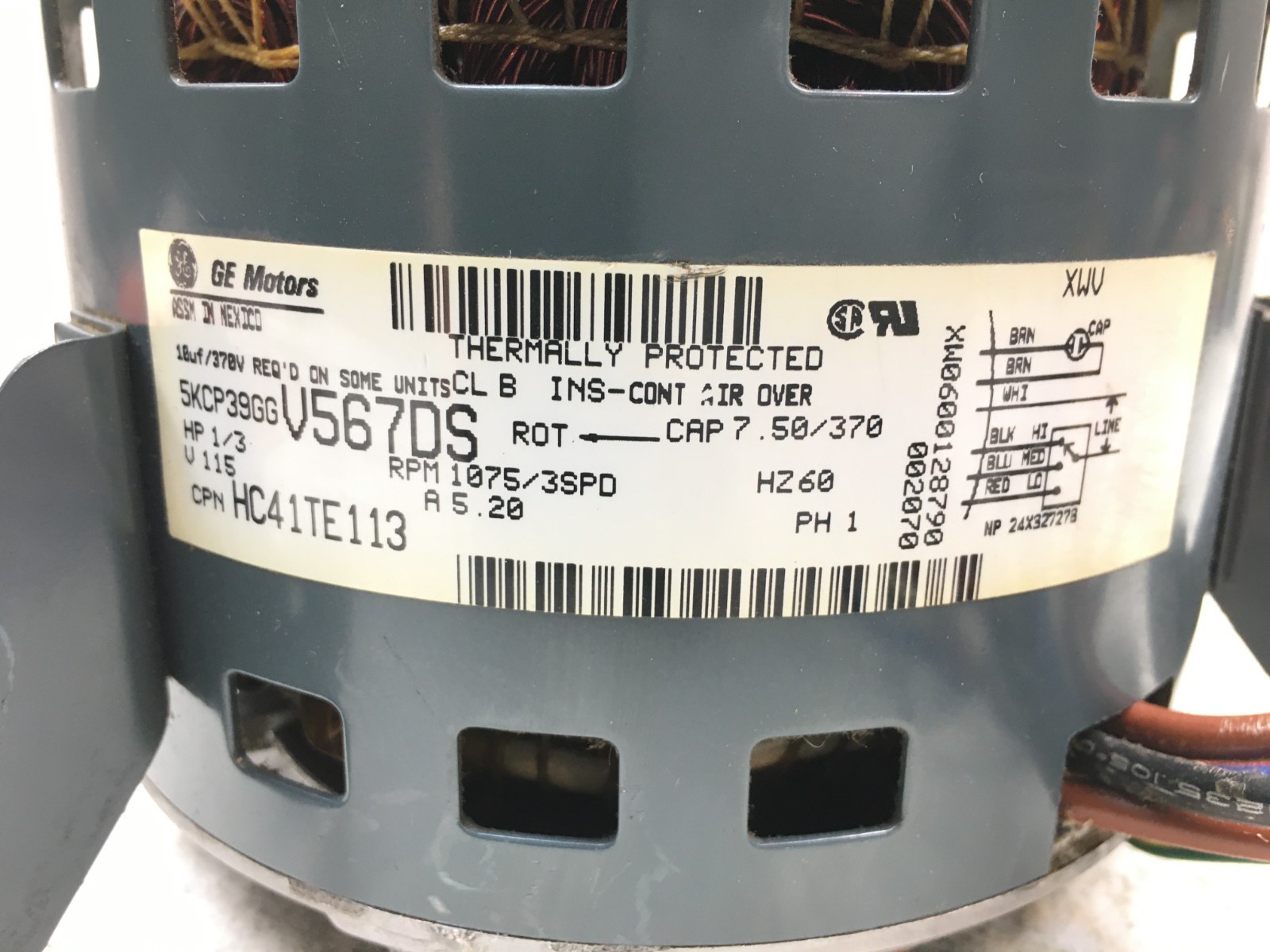 This is GE Motors 5KCP39GGV567DS Blower Motor 1/3HP 1075RPM 3SPD 115V HC41TE113 used part.