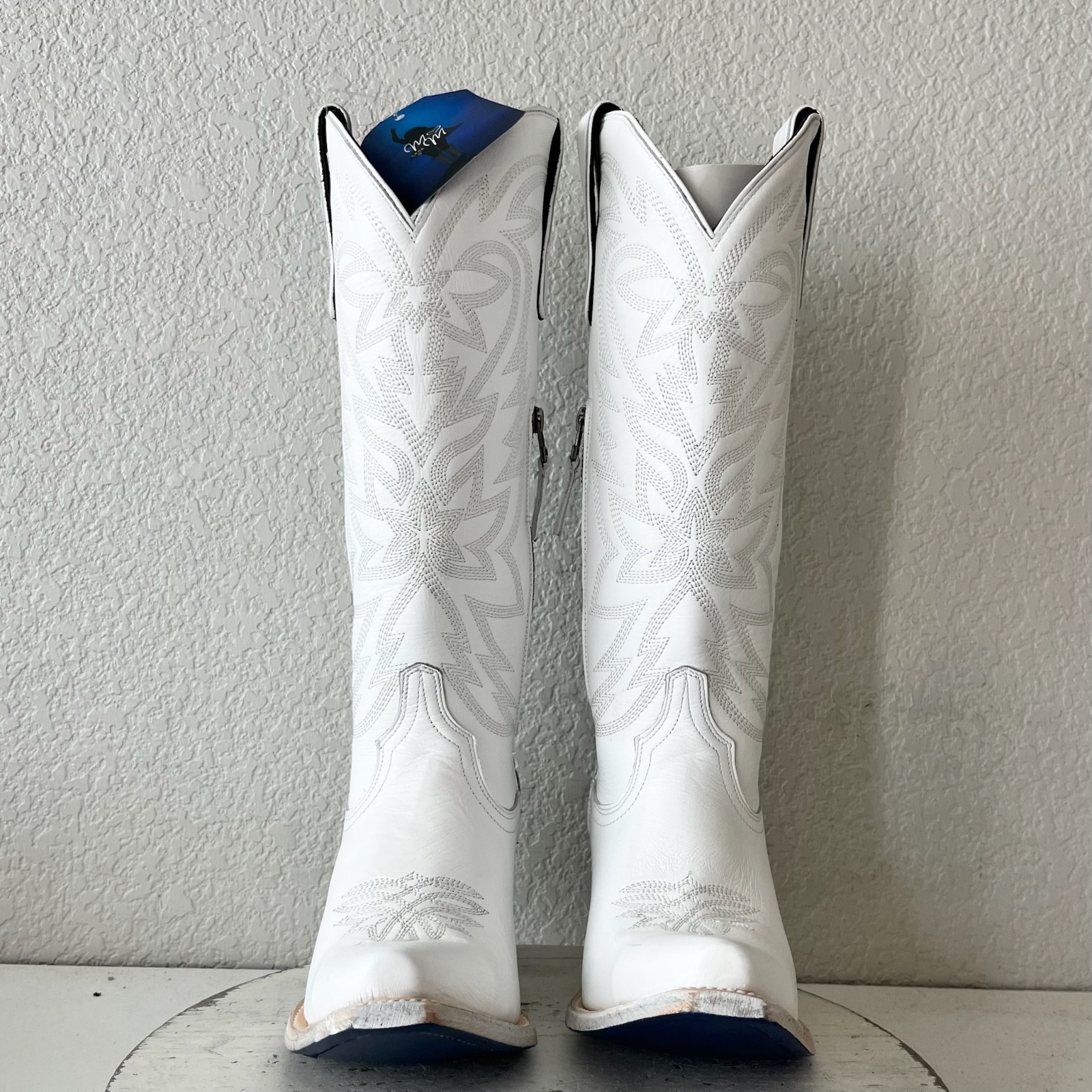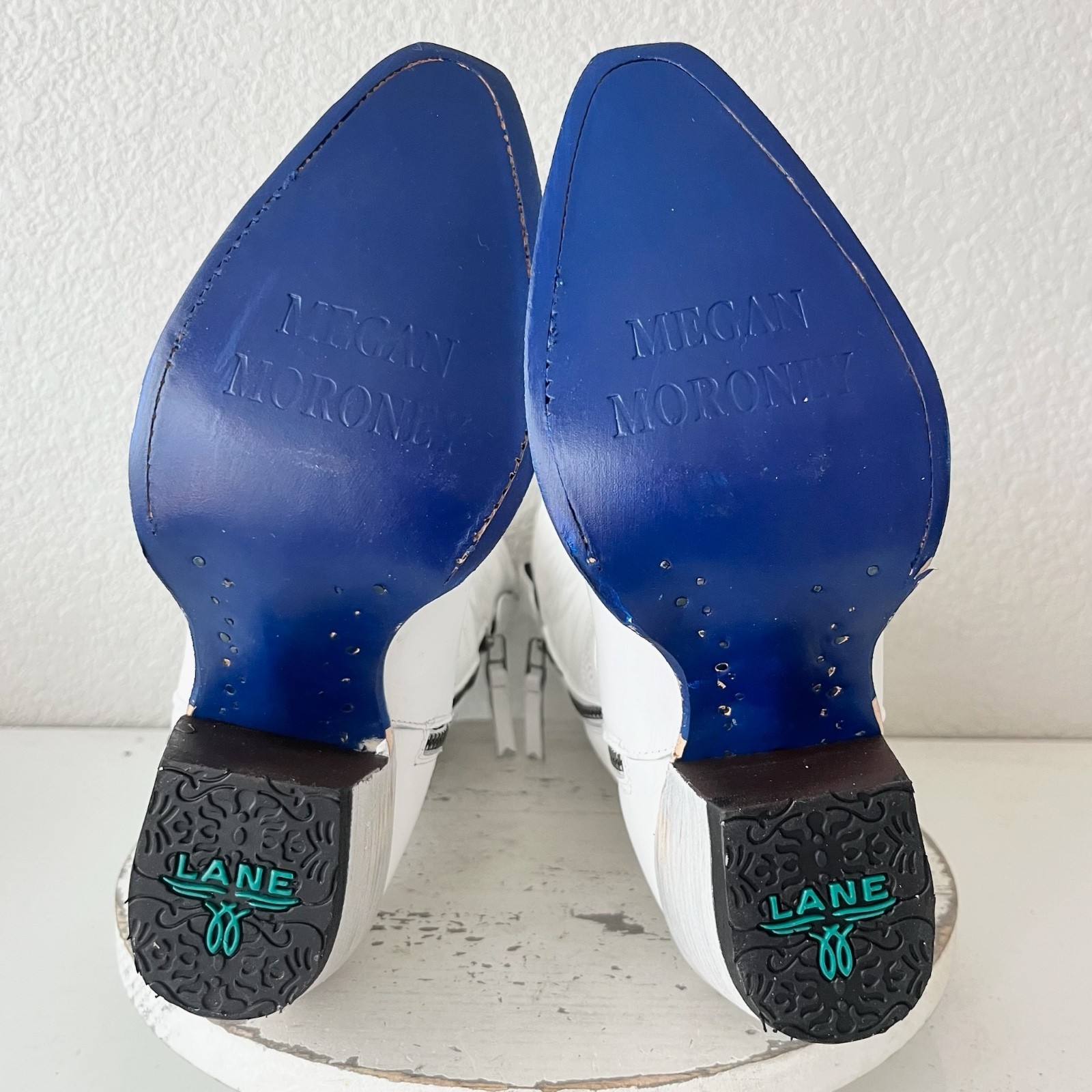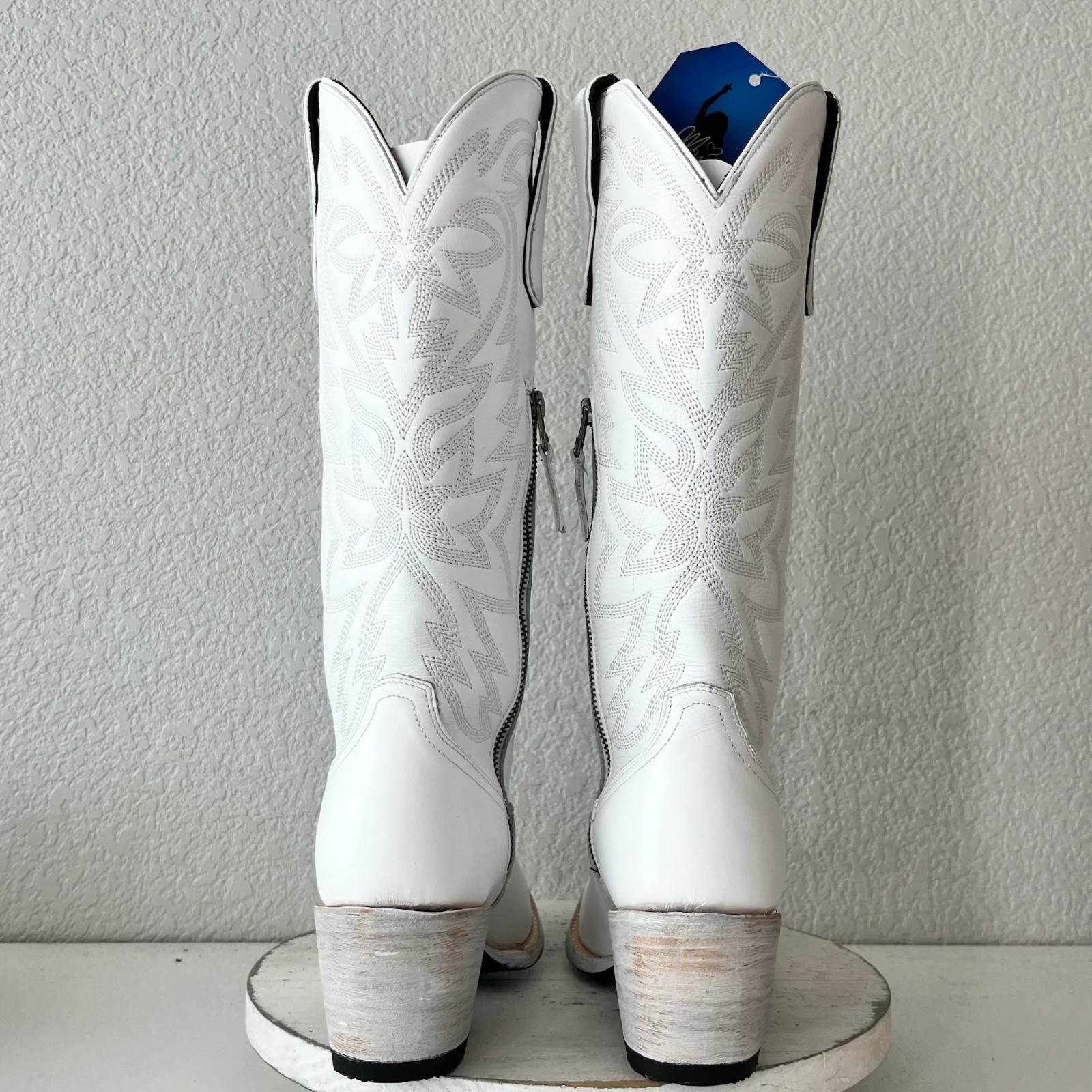 About the Boots: Designed to make a statement, this limited-edition Smokeshow features matte white leather with intricate embroidery that embodies both elegance and tradition. The scalloped edges and functional side zipper ensure the perfect mix of style and practicality. But the real standout details? Megan?s signature blue bottom, imprinted with her name, and a heart-shaped heel pin?a personal touch that makes this boot uniquely hers. Whether you're a die-hard Megan fan or simply love Western fashion, this boot is made to be worn, loved, and remembered.