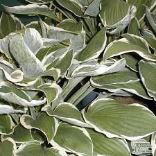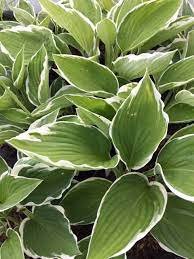 Enhance your garden with the unique beauty of Hosta plants in a light army green color with a touch of grayish white at the edge!