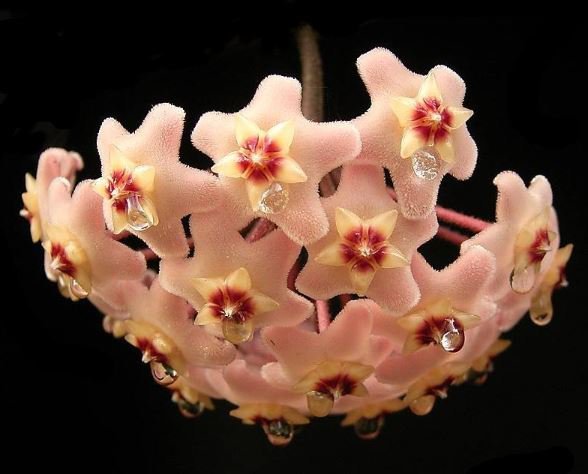 Hoya carnosa has been in cultivation for more than 200 years and has given rise to many cultivars that vary in foliage form or flower color. In cultivation in the UK it has gained the Royal Horticultural Societys Award of Garden Merit.
