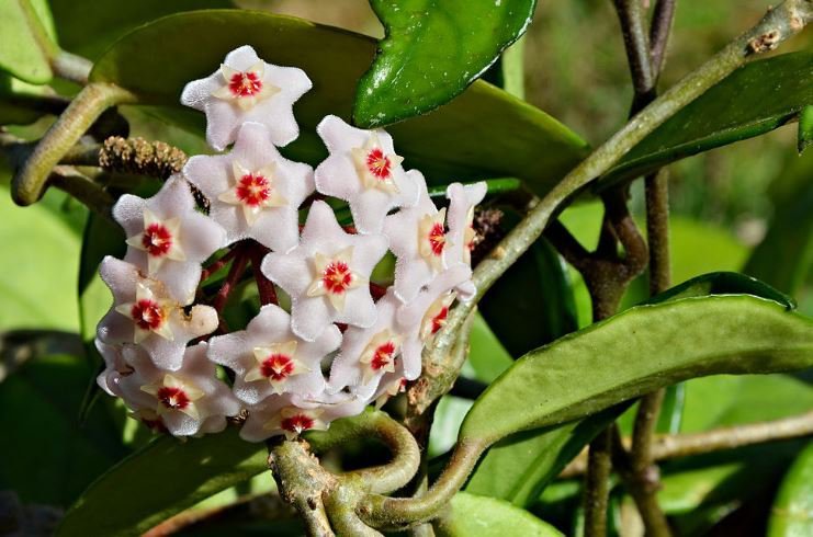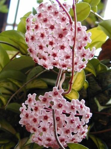 Hoya carnosa, the porcelainflower or wax plant, is an asclepiad species of flowering plant in the dogbane family Apocynaceae. It is one of the many species of Hoya that are native to Eastern Asia and Australia. It is a common house plant grown for its attractive waxy foliage, and sweetly scented flowers. It is grown well in pots and hanging baskets.