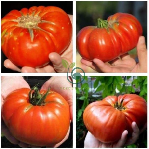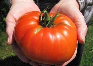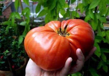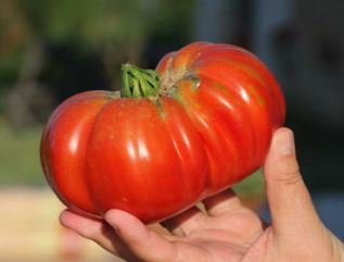 A beef tomato (British English) or beefsteak tomato (American English)[1] is one of the largest varieties of cultivated tomatoes, some weighing 450 grams (1 lb) or more. Most are pink or red with numerous small seed compartments (locules) distributed throughout the fruit, sometimes displaying pronounced ribbing similar to ancient pre-Columbian tomato cultivars. While popular among home growers for beef sandwich toppings and other applications requiring a large tomato such as toppings on large steaks, beefsteaks are not grown commercially as often as other types, since they are not considered as suitable for mechanization as smaller slicing tomatoes.