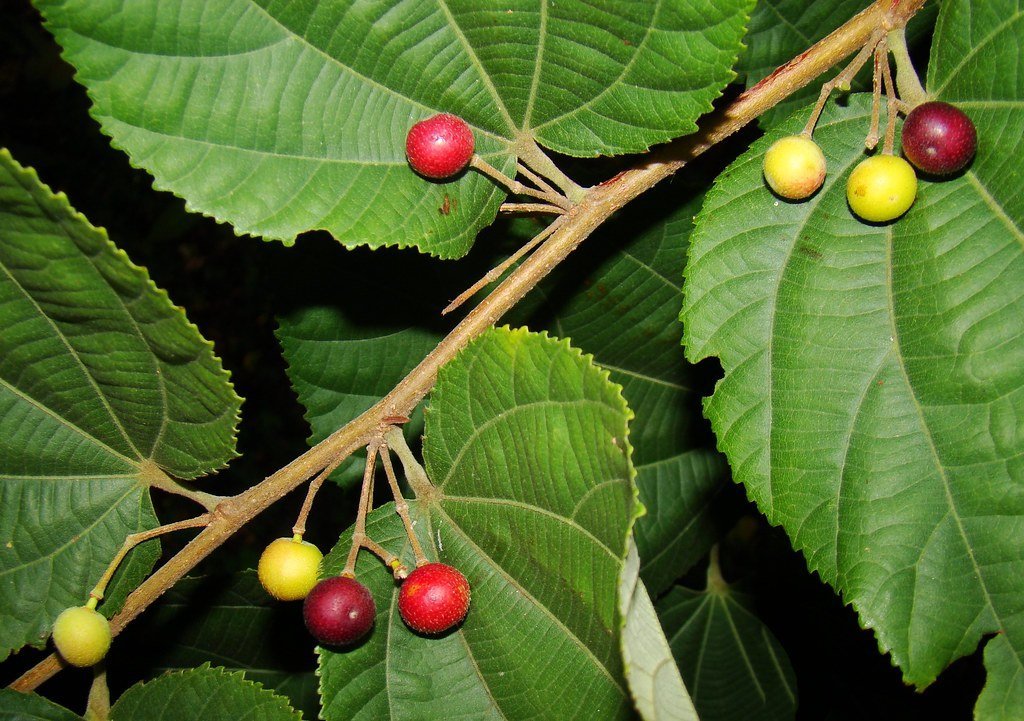 It is a shrub or small tree growing to 8 m tall. The leaves are broadly rounded, 518 cm long and broad, with a petiole 11.5 cm long. The flowers are produced in cymes of several together, the individual flowers about 2 cm diameter, yellow, with five large (12 mm) sepals and five smaller (45 mm) petals. The fruit is an edible drupe 512 mm diameter, purple to black when ripe.