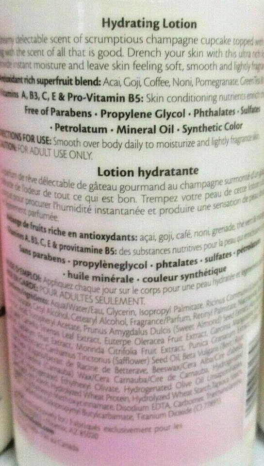 Cupcake Couture with Sweet Almond Extract Antioxidant Rich Superfruit Blend 1 Acai, Goji, Coffee, Noni, Pomegranate, Green Tea, Mangosteen 4 Vitamins A, B3, C, E, Pro-Vitamin B5 3 Skin Conditioning Nutrients Enrich the Formula The dreamy delectable scent of scrumptious champagne cupcake topped with pink frosting oozing with the scent of all that is good. Drench your skin with this ultra rich lotion created to provide instant moisture and leave skin feeling soft, smooth and lightly fragranced.