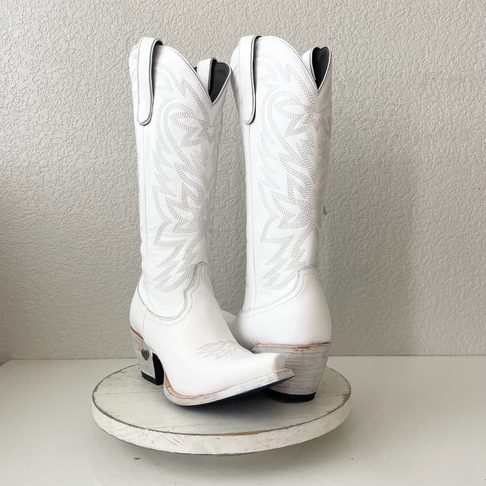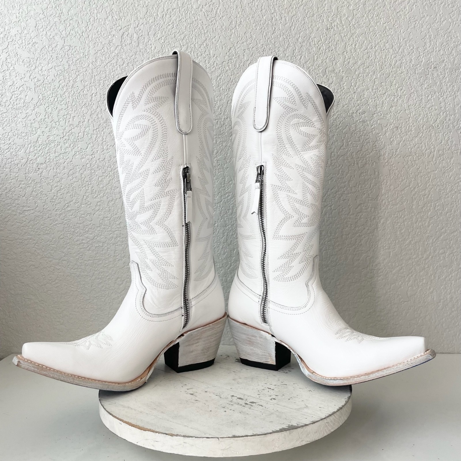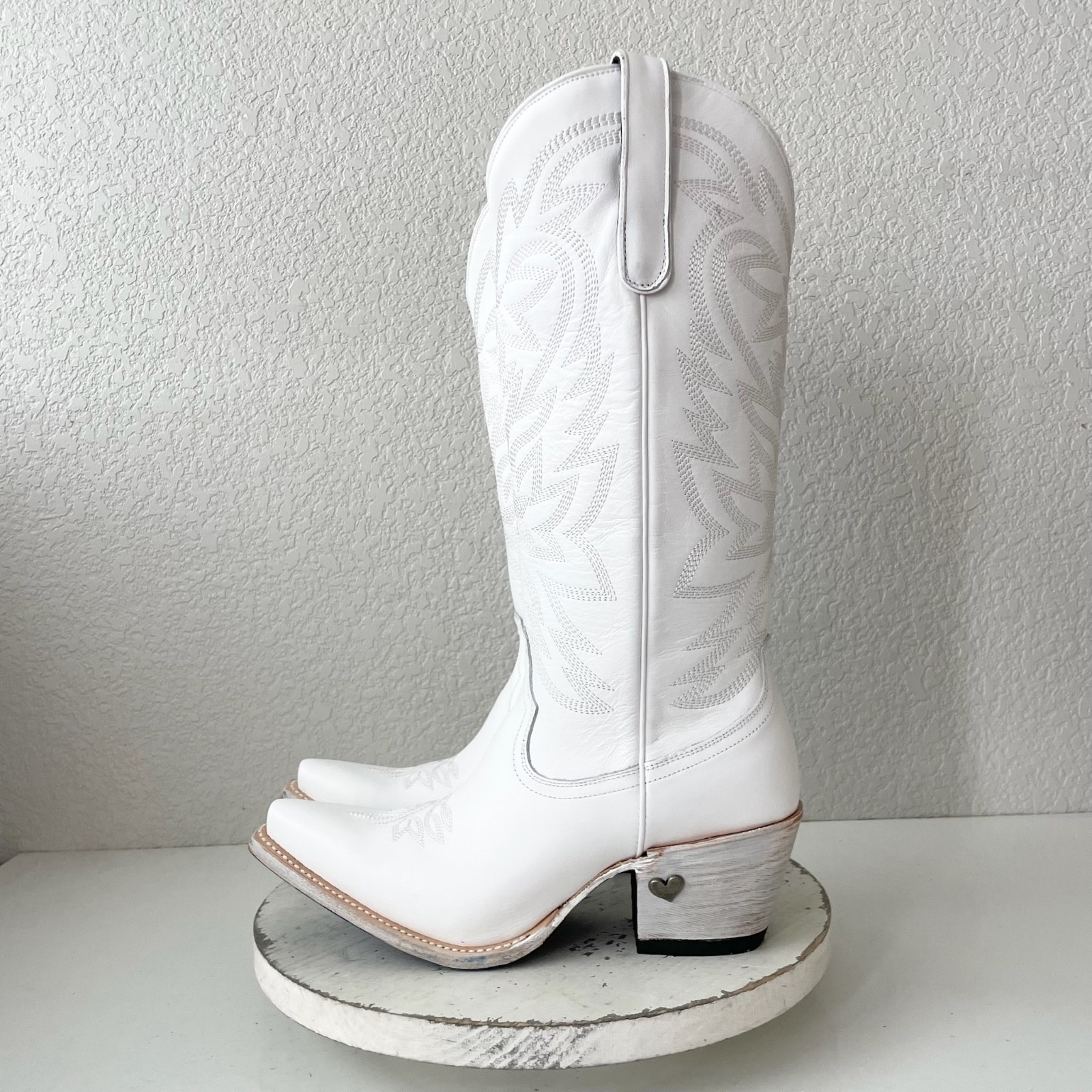 Lane MEGAN MORONEY Boots - SMOKESHOW Womens Cowboy Boots in Matte White Leather with a Western Snip Toe, 15" Mid Calf Tall shaft with Zipper Closure